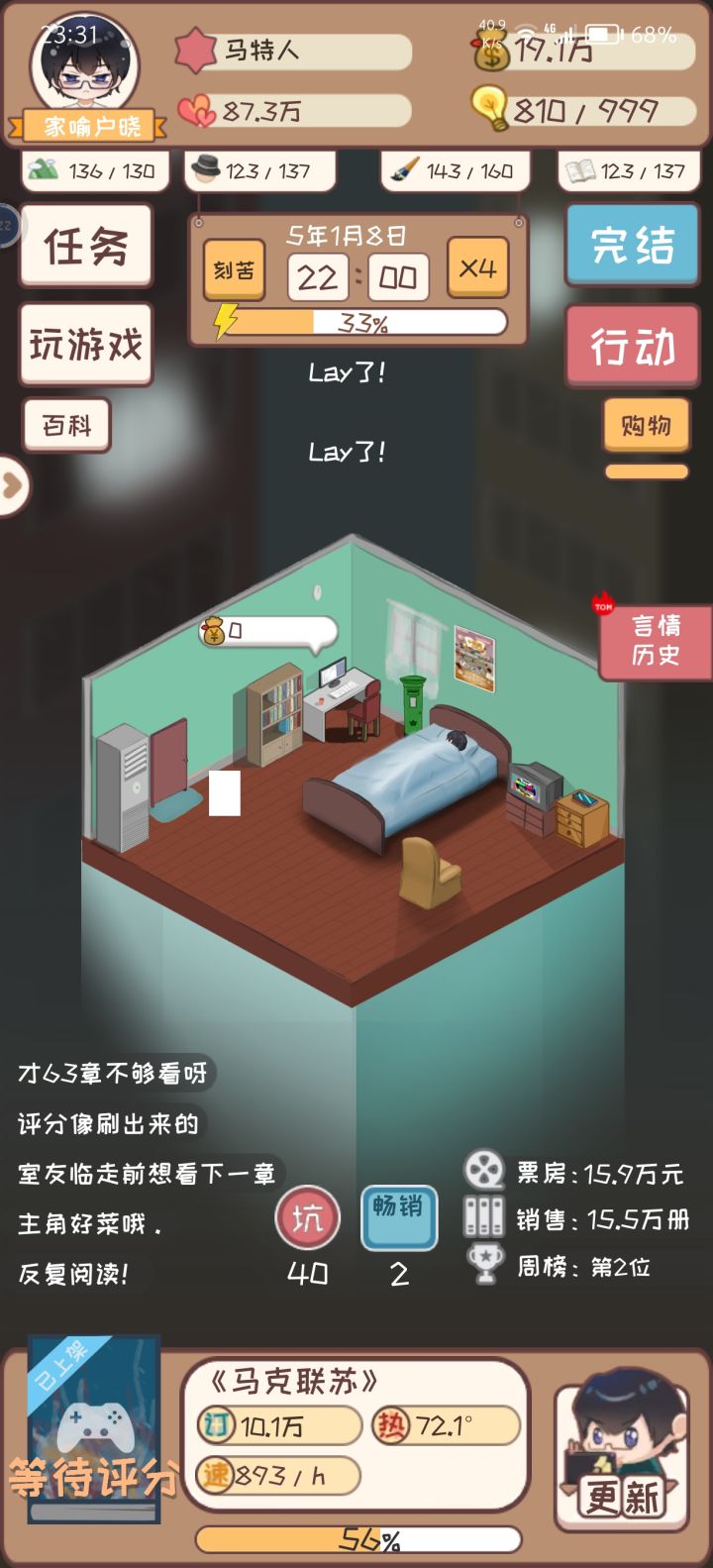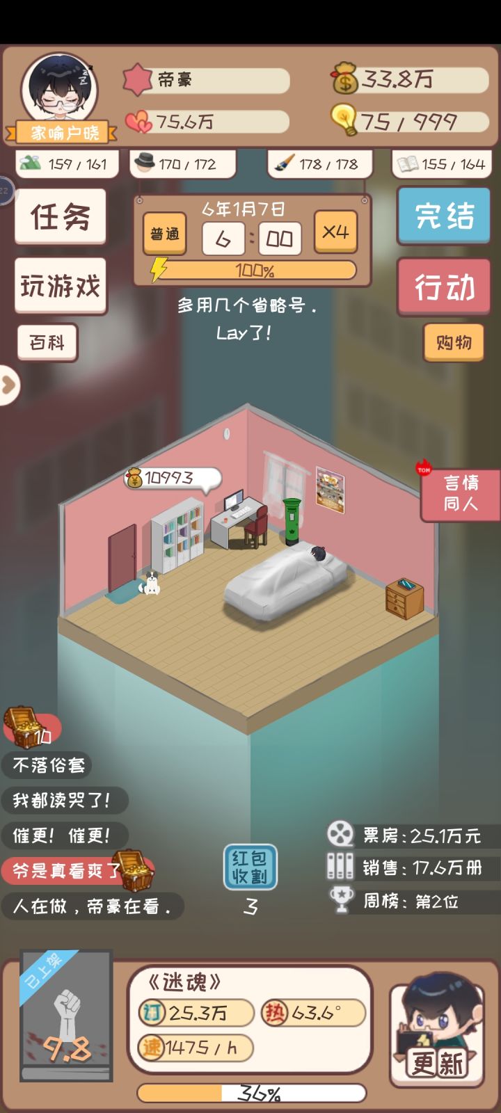 ?前几星期开个小号,玩到作家排行前10就没玩了。最近看了下,一百万块钱给我搞没了(下面1图不是)其他四维也掉了,粉丝也没了。什么鬼?