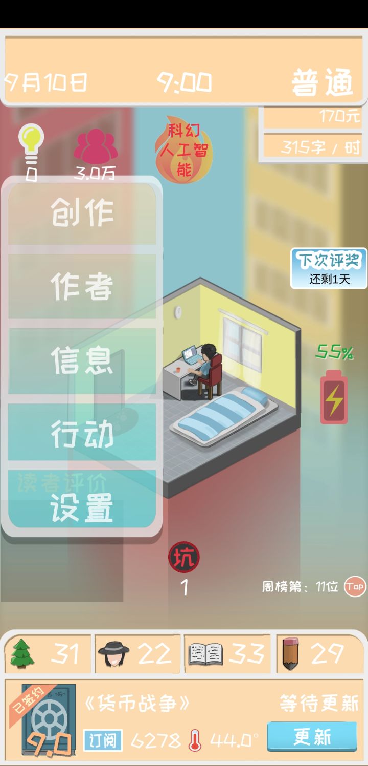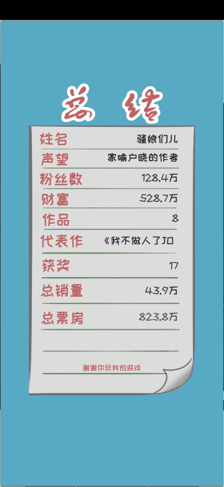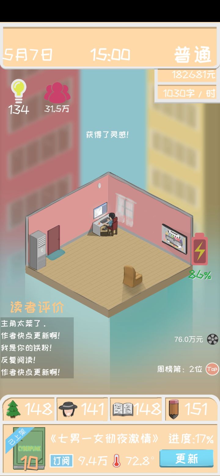 知道这款是模仿一个做漫画的游戏。提几个要求:想问下游戏里是不是每个月只有10天?输入灵感的时候数值希望在上面,而且那个条挪动起来太费劲了,不如输入数字。还有断崖式书评。迷之粉丝。粉丝到底有啥用啊?