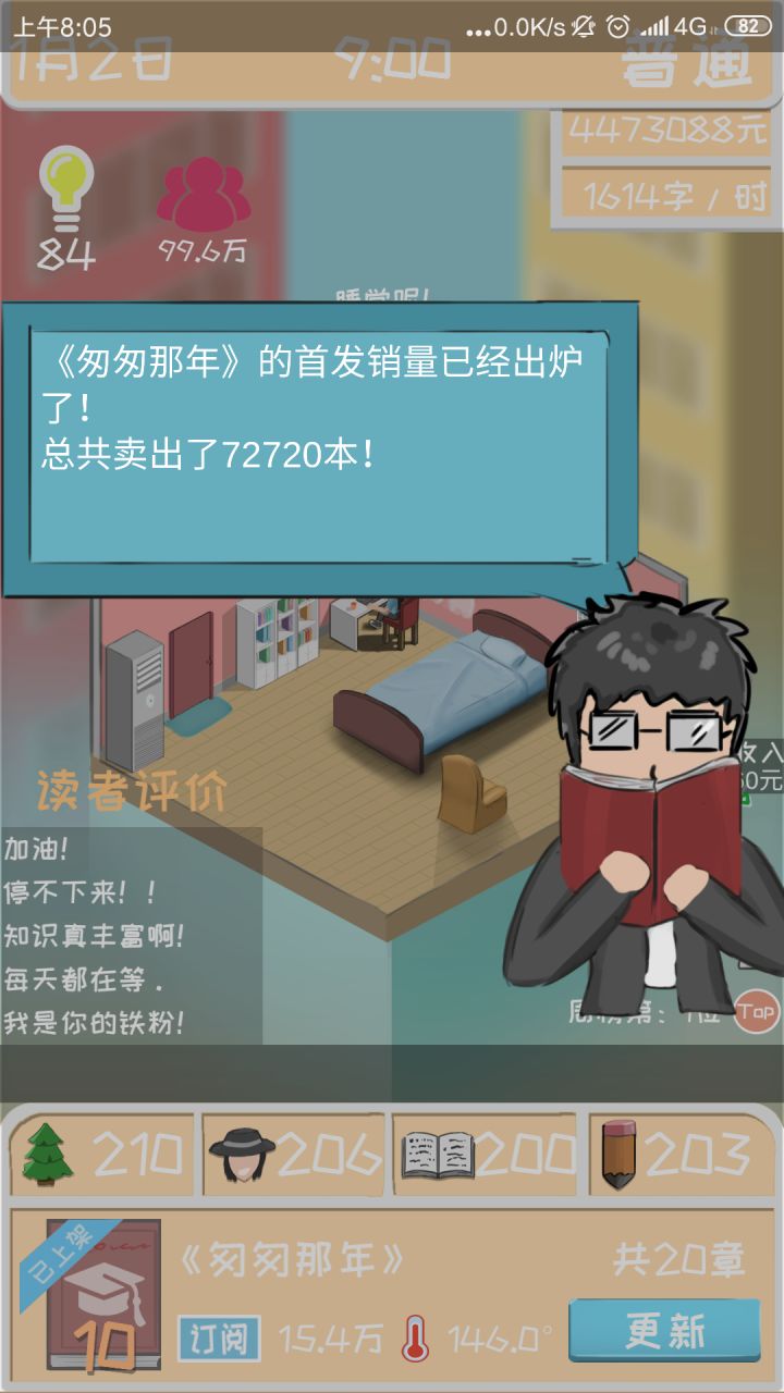 玩了一下午,好多次,看了各种攻略,开局属性刷的也高,第一个月刷灵感刷到三百多,然后刷四维,然后写书,都是保持在体力百分之六十以上,差不多一个月一章,中间有空余赚赚稿费什么的,一开始没有评分的时候,评价都挺好,但一出评分就是四点多五点多,然后评价就特别差,怎么试分也不涨,灵感一直也是给的积极,简直服气,我寻思我是不是遇到什么bug了,题材也是相互对应合适的,真是不知道问题在哪里,快给我玩哭了