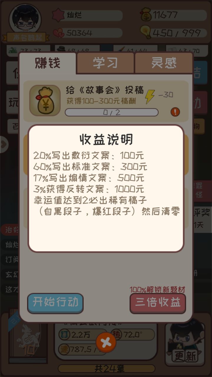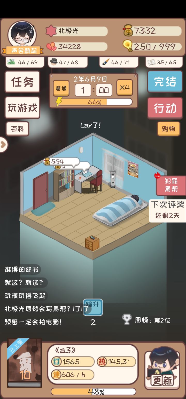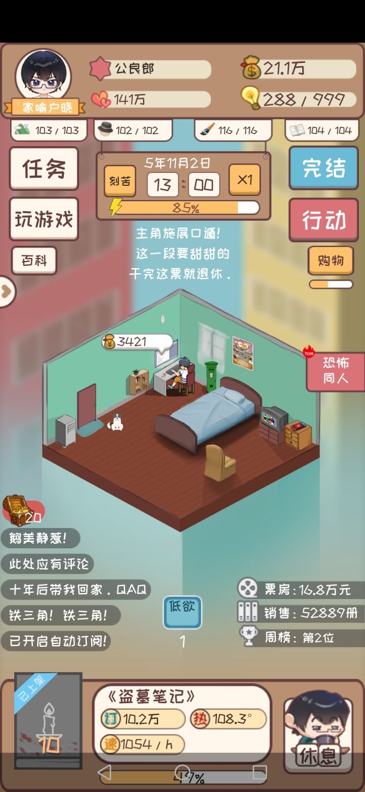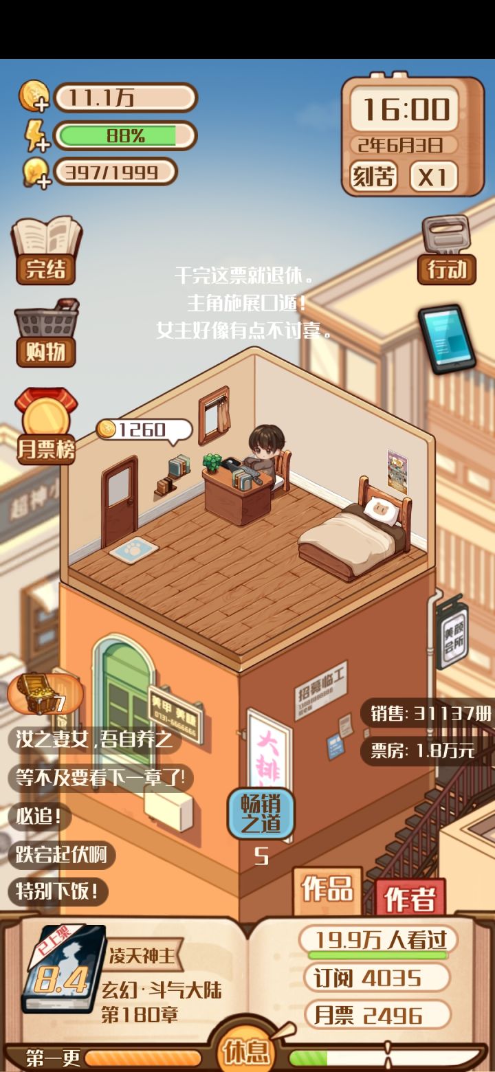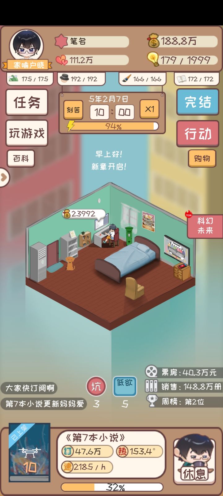 评价一下,游戏的数值成长体系不太合理,订阅数,粉丝数不是按照一定比例成长,到了后期都是按照固定数值成长的,每次出书,拍电影粉丝就加一百万左右,怀疑是为了水时长。另外,订阅数增加的太不合理了,白天更新时60万订阅,晚上睡个觉就掉了10万,还有没有天理了,闹着玩呢?