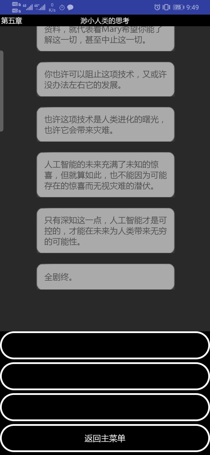 我是一名在校大学生,人工智能专业并对社会心理学也有一定的涉猎,这款游戏整体来讲,剧情设计和人物塑造做的都挺不错的,也确实提出了制作人关于一些伦理问题的思考,是个好游戏。我认为还可改进的地方有:1.卡关bug,一些错别字和漏字问题。2.可适当增加一些插图,并不需要做工多精良,只需简单线条填充辅助作为场景描述,更容易使玩家有代入感。或者提高文字描写质量也可。3.有些问题的询问,顺序并不会造成任