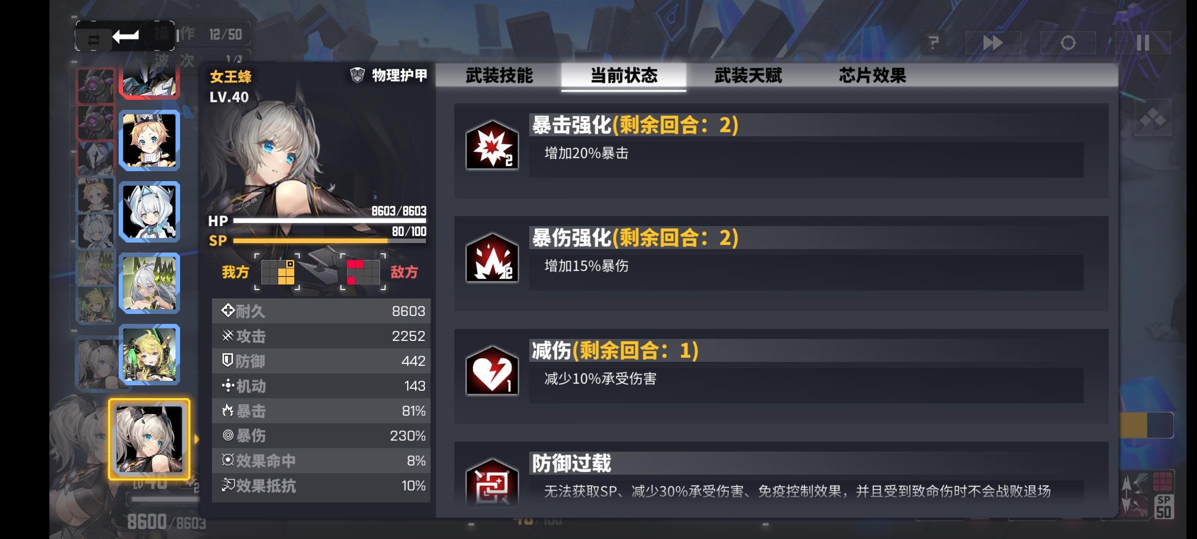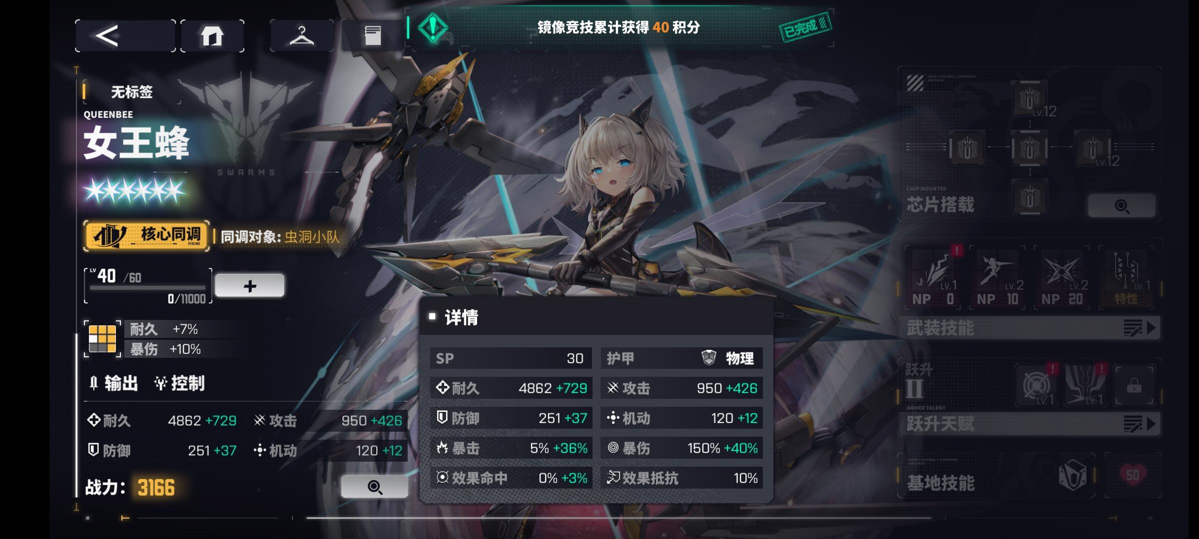 这里是一个女王蜂的同调强度简单测试一图为基础面板,二图三图为同调两角色战斗面板,吃了一个进行曲的暴击爆伤加成重点来了四图面板显示的效果,大概是,吃到了被同调角色的一半攻击防御和血量,其余加成均没有体现,但是自身吃的加成疑似被锁面板(进行曲的暴击爆伤加成未显示增益)图五直接吃到了第二次进行曲的暴击爆伤加成,特意多磨了一回合上一道加成还在,意味着锁面板,这个含金量简直不要太高