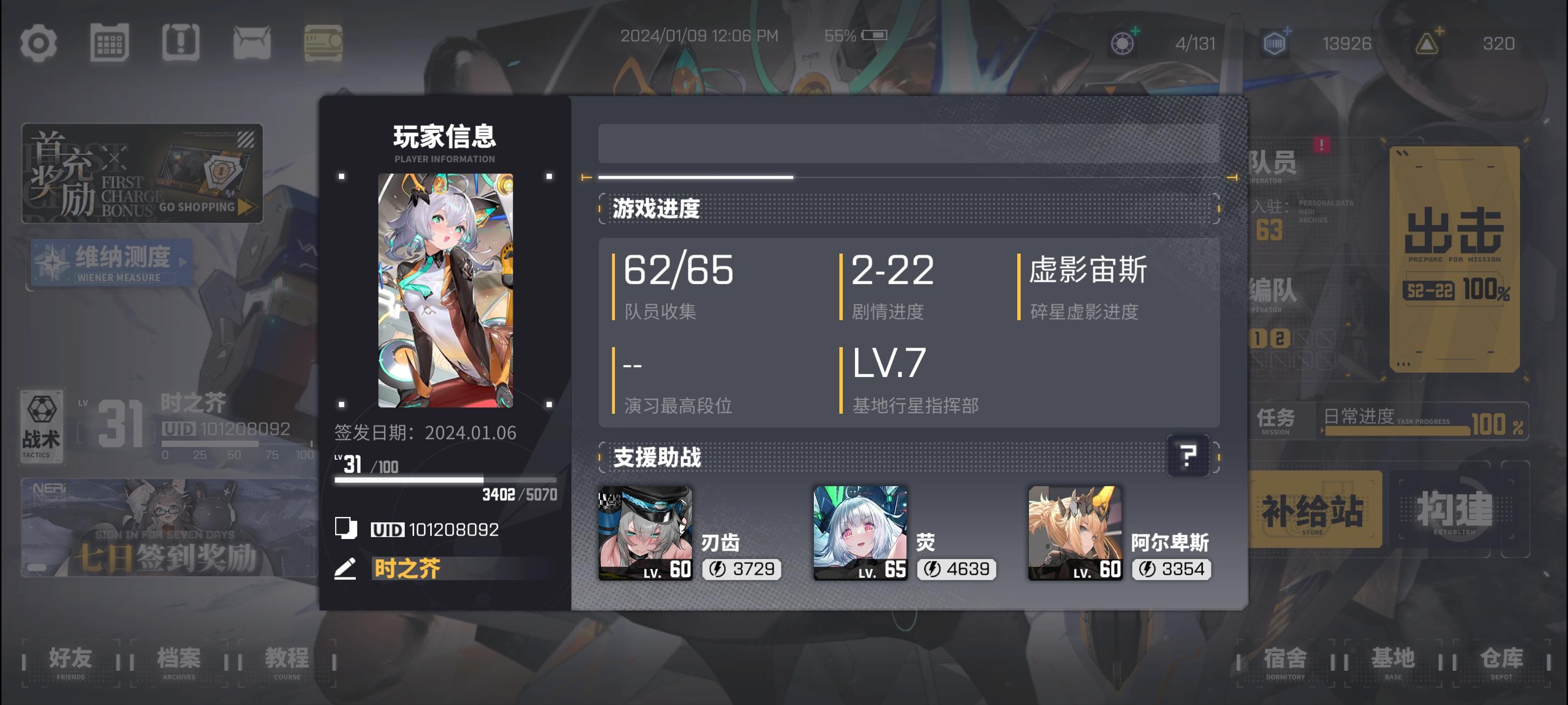 竞技场一直锁着也是难蚌。这号现在就满潜荧,二潜杜兰,其他全是一只再等三天签到什么的应该可以再把星坠捞出来虽然星坠没啥用1月10日改贴又出了个杜兰,星坠保底又延后了,已经卸载了,索然无味总体上这游戏公测版本主要借鉴(chao)的明日方舟,玩过粥的很多概念基本都能照搬进来,玩法上阵容摆放借鉴的少前一,但是不如少前一,因为少前一那老古董战时