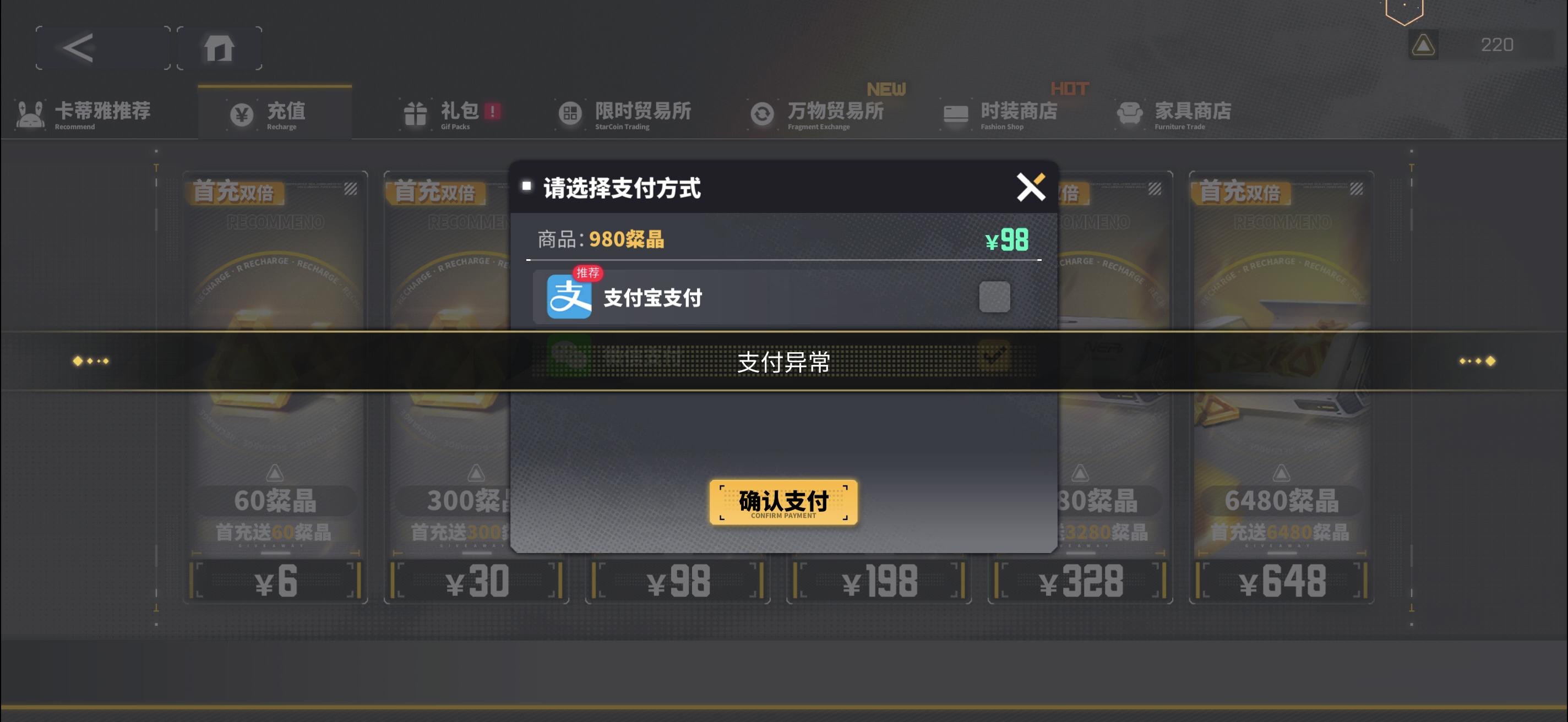 似乎充值渠道有问题,一点充值就显示支付异常