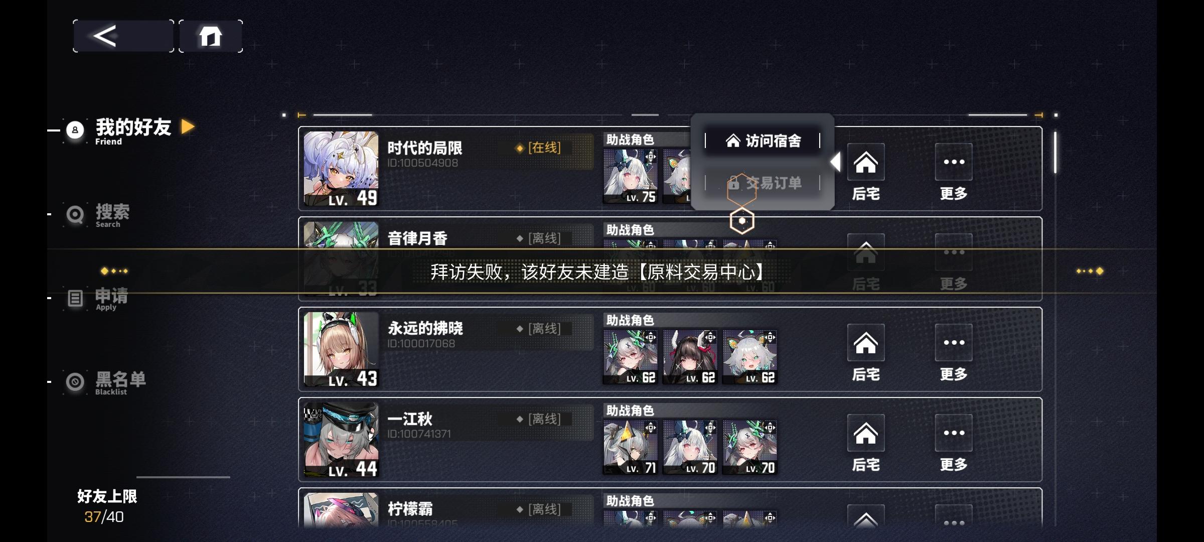 好友在线状态时,不能通过好友列表访问好友交易所想访问的话,可以从基地中的交易所进行好友访问