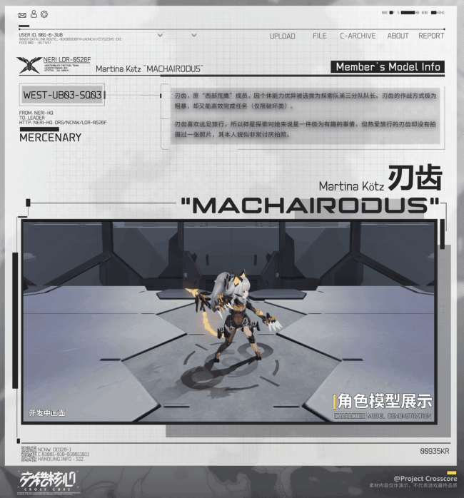 【角色动态演示】……数据传输中 █████ 100%档案接收完毕 √代号:刃齿 武装类型:不朽探索队第三分队队长——刃齿,曾作为维州佣兵组织「西部荒鹰」的一员活跃于战场之中,其行动方式简单粗暴,往往会选择直接突击的战术完成任务。“拍照?我不喜欢拍照,我觉得我不需要那些用来回忆的东西,这些画面只要留在我记忆中就……诶?和总队长合照吗?那……也不是不行。”*以下素材仅作演示,不代表游戏最终