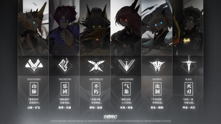 为了应对环境复杂的异星战场,NERI总部开发出了六种类型的武装。因融合了异星技术,这些武装无法以常规方式启动,只有适配者与武装达到高度共鸣的人才能够驾驭。目前探索队的成员皆适配了与自身相性一致的武装,并获得了由武装所赋予的代号。武装代号原型:【山脉】——自然山脉、矿石种类【乐团】——音乐术语、乐器名称、曲调风格【不朽】——野性自由的猛兽【气象】——气象术语、自然现象【虫洞】——昆虫及昆