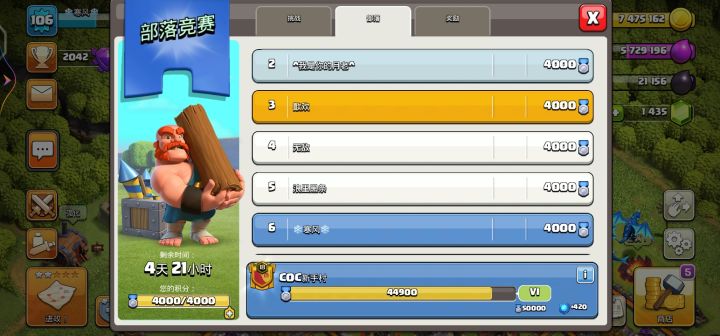 部落竞赛做完了,第六名,不得不说真太卷了😂顺便宣传一下我们部落:国服18级,友好❤️,不会乱踢人,有意向的可以加入,部落需要新鲜的血液注入,欢迎!