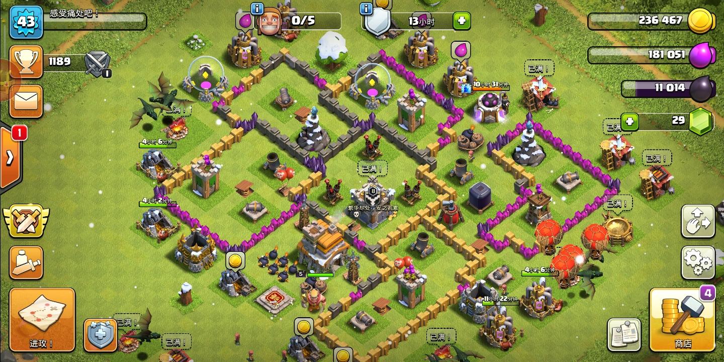 随着三王等级越来越高以及第四个新英雄闰土的加入,我隐隐约约有感觉四个王的攻击能力甚至可以拆掉全部的建筑。随着自己的测试,我越发的觉得这种感觉是正确的。在最初实战测试时我发现,如果是只携带20天使而不使用其他任何单位,对三星的限制实在是太大。天女往往无法清边让女王顺利进入阵型中心,即使有时可以冲入阵型中心。收尾时间也经常不够。因此适当的减少了天使的数量,改为了15天使+9炸弹人13法师的配兵(如果