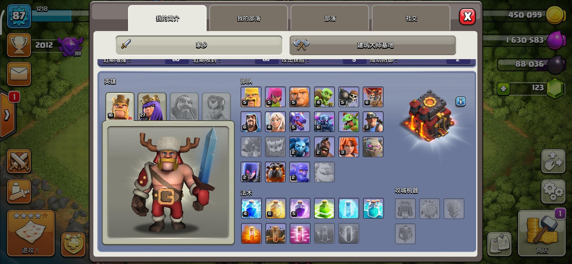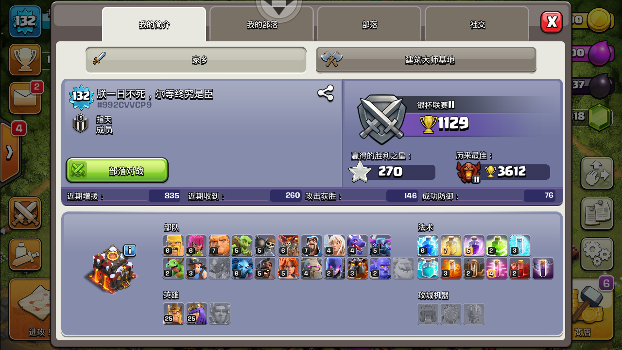 众所周知,判断一个阵的防御力主要就看墙,所以很大速本为了提高防御力都是先刷墙的。这是我主号,一半12级墙,一半13级墙。所以可以把这号的防御看成12本中期。同理,本次的主角是我的小号,速13本。部落战防御了6次黑3进攻。大部分城墙都是11级。所以可以当作11本初期防御。总结是对方部落战虽然赢了,但是连我这初11防御的号都打不到1星。大家可以当作这次部落战是打平手。最后大家不要反驳我说什么逻