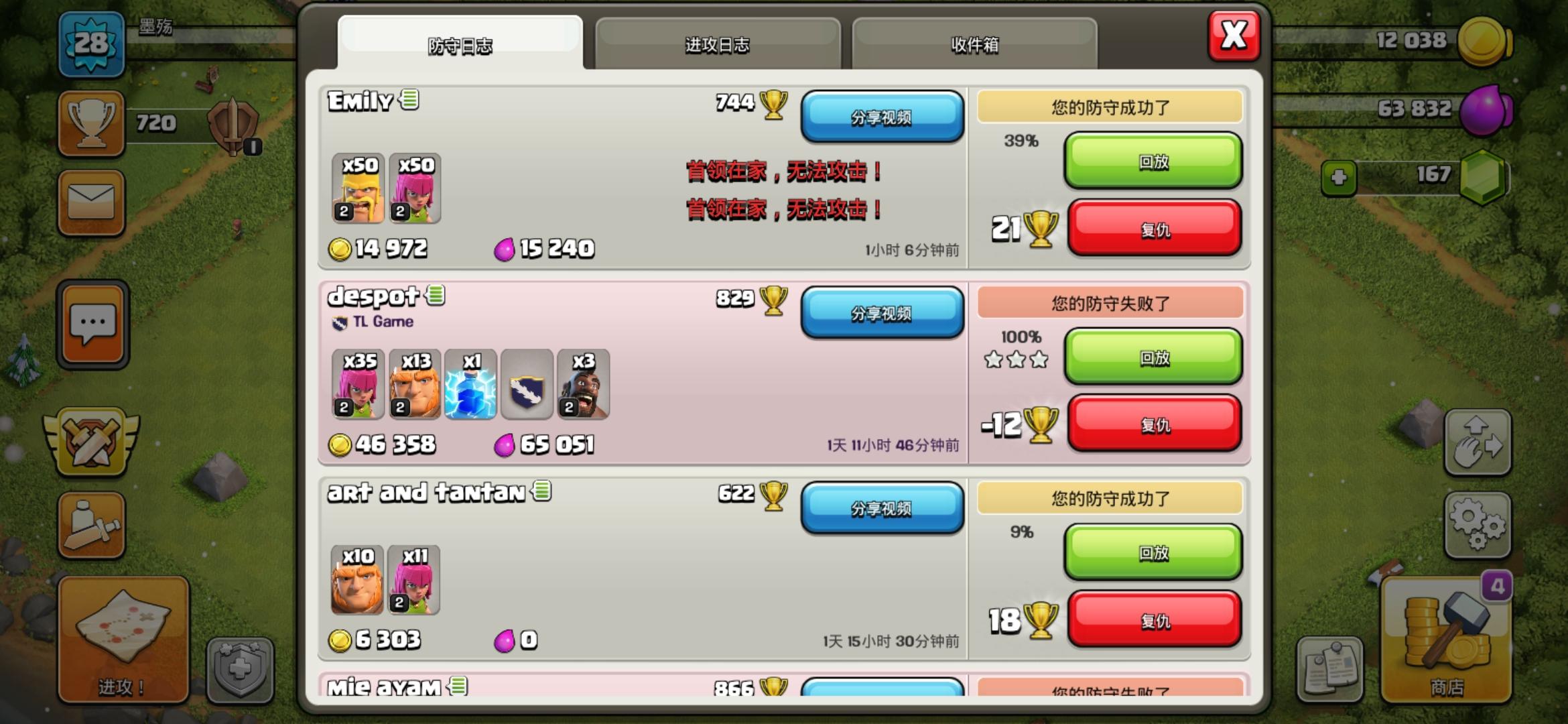 有个人攻打我部落里,我想复仇,但是他一直在家,都几个小时了,我想问一下他是不是开脚本了。他要是一直提示有护盾还可以解释,但是他一直在家,那就说不过去了。