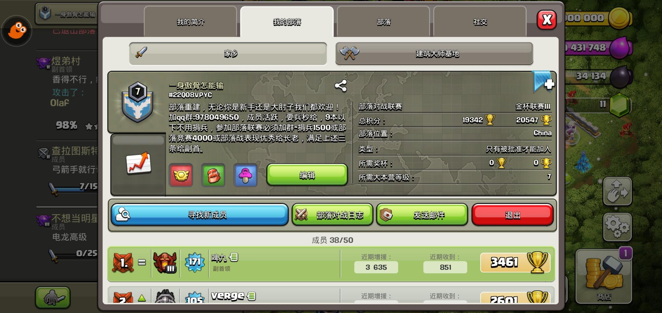 这是个策略经营游戏,不可否认,在这个游戏中五湖四海的朋友聚在一起,畅谈游戏经验,两个月前,曾经聚在一起的战友回归,这当然是一件非常值得庆祝的事情,我把他拉到了我自己的部落,部落原来都是十二本养老团队,偶尔打一打联赛,他是个认真的人,想把部落变成一个超级活跃的地方,曾经一起征战的人就要有人退出,两个月的时间,我一点点看到了部落又像曾经那样充满活力!!!铁打的营盘流水的兵,在这个游戏中体现的淋漓尽致,