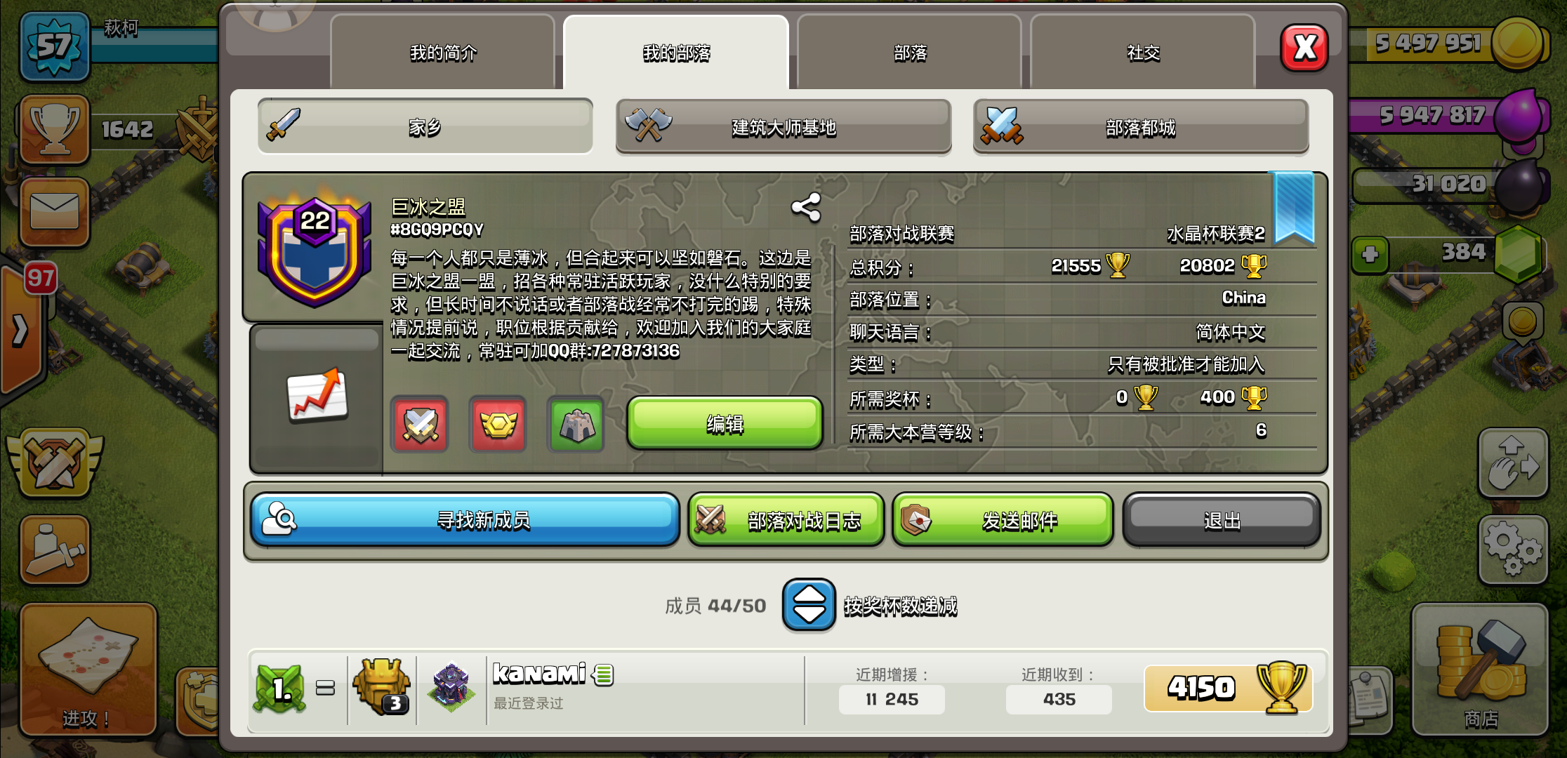 国际服22级部落重建招人,没有条条框框,要求就是活跃和部落战打完,欢迎各种欢迎萌新和大佬,Q群:727873136,标签:#8GQ9PCQY,人满了可以加二盟