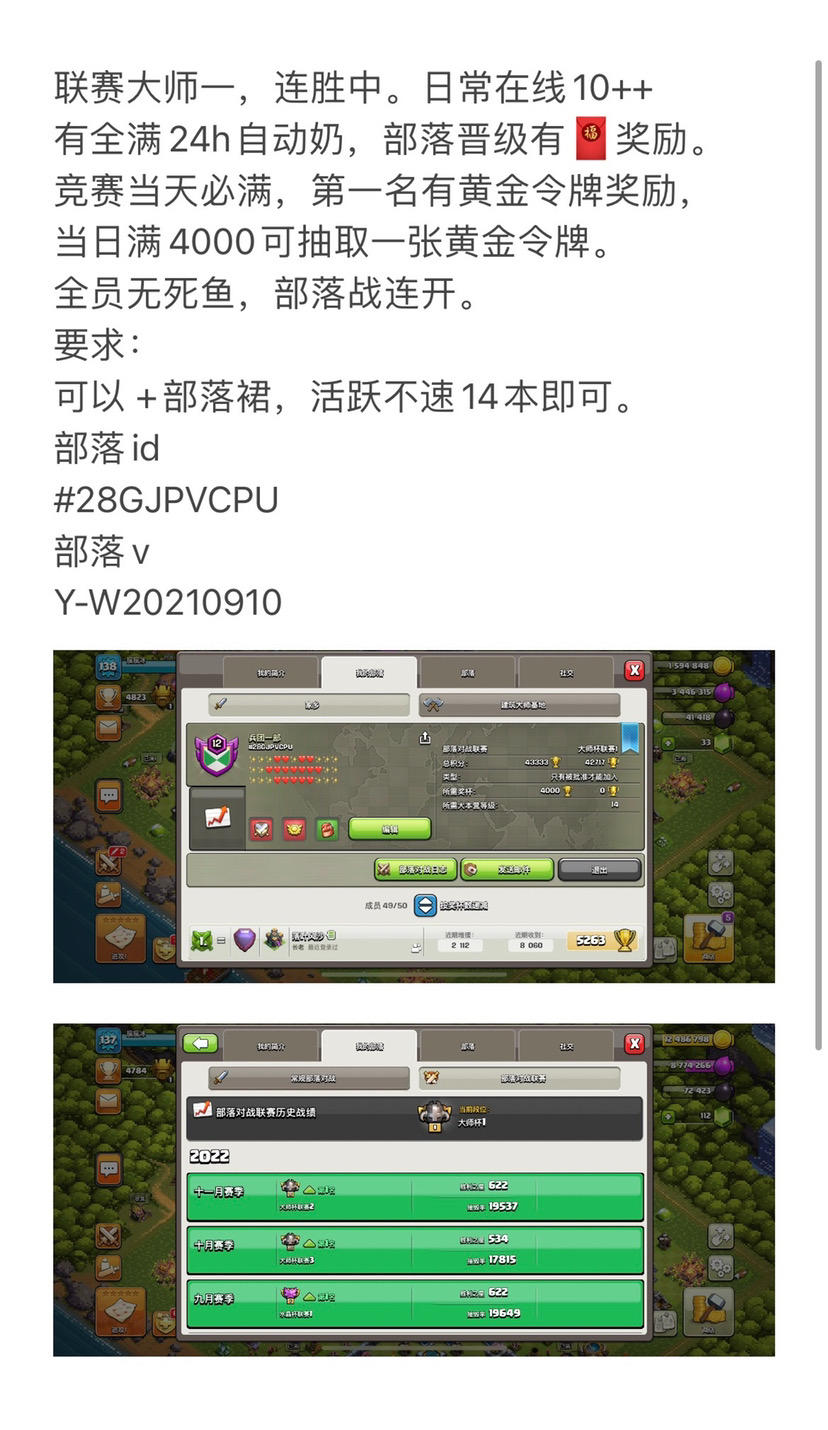 联赛大师一,连胜中。日常在线10++有满24h自动奶,部落晋级有🧧奖励。竞赛当天必满,第一名有黄金令牌奖励,当日满4000可抽取一张黄金令牌。全员无死鱼,部落战连开。要求:可以 +部落裙,活跃不速14本即可。部落id#28GJPVCPU部落vY-W20210910