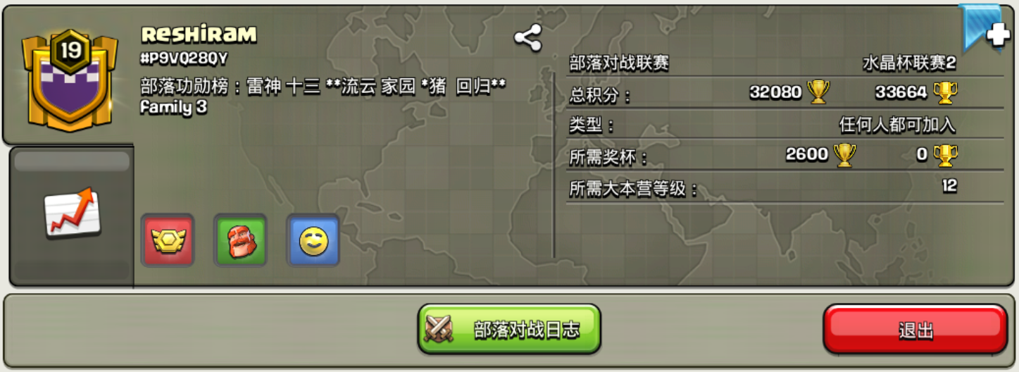 部落标签:P9VQ28QY比较老的一个休闲工会,适合养老。19级部落超佛系。有专门的奶妈号。目前只做部落竞赛和联赛。部落竞赛无压力,联赛段位水晶二。主要活人太少,本月联赛只有18人参战。可教学,可唠嗑(目前吹牛可能少点)。游戏内搜索部落标签申请。因为发黄色广告的人渣太多,设置为有少许限制,所以新人可以加我#QYV9CQJJ0。