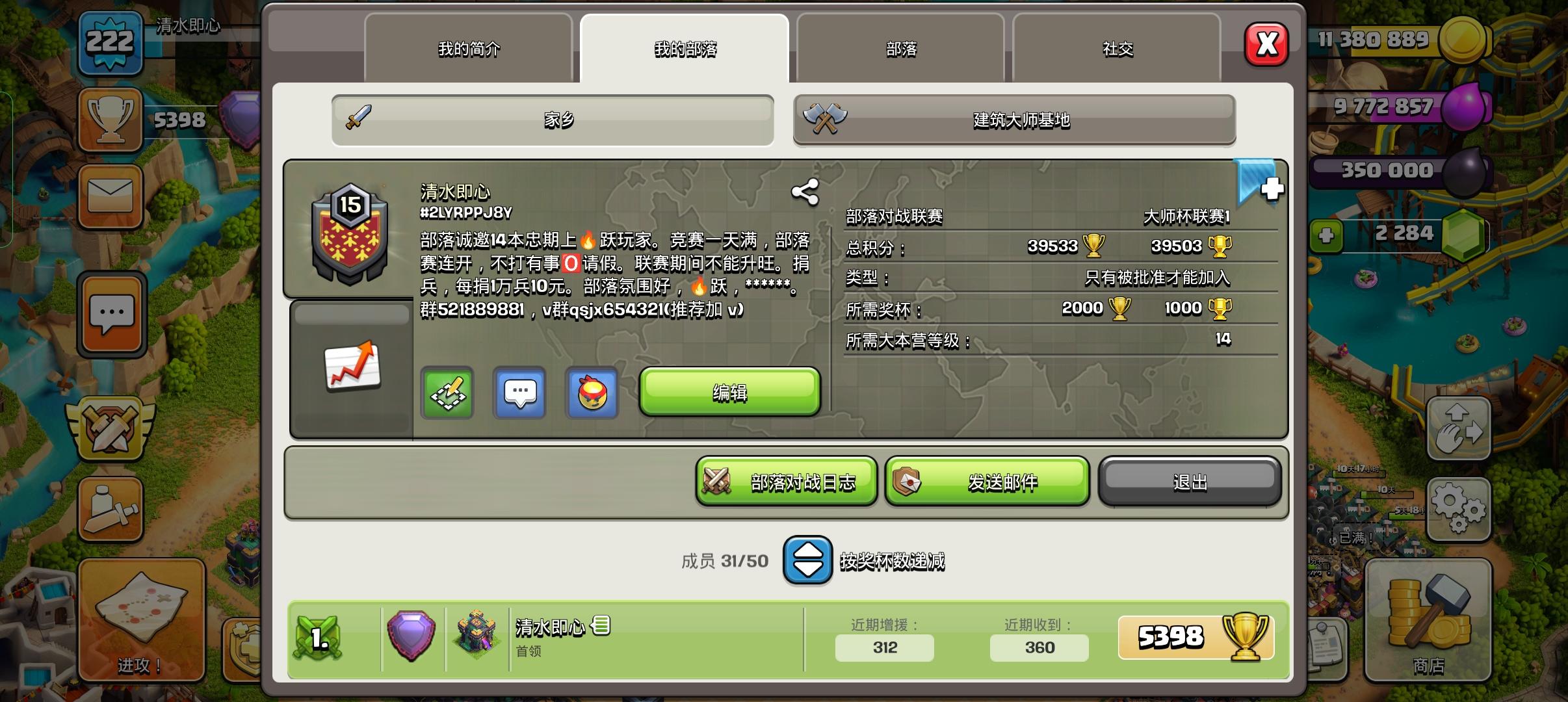 诚邀14钟后期玩家。部落捐兵,冲杯,联赛均有洪保讲礼。部落气氛好,详细v:qsjx654321。一个月一张月卡不难。福利一:每个月杯数排名30/20/10。福利二:捐兵一万奖励10。福利三:联赛名次越好红包越大。福利四:不定时开始部落友谊赛各种活动。#2LYRPPJ8Y