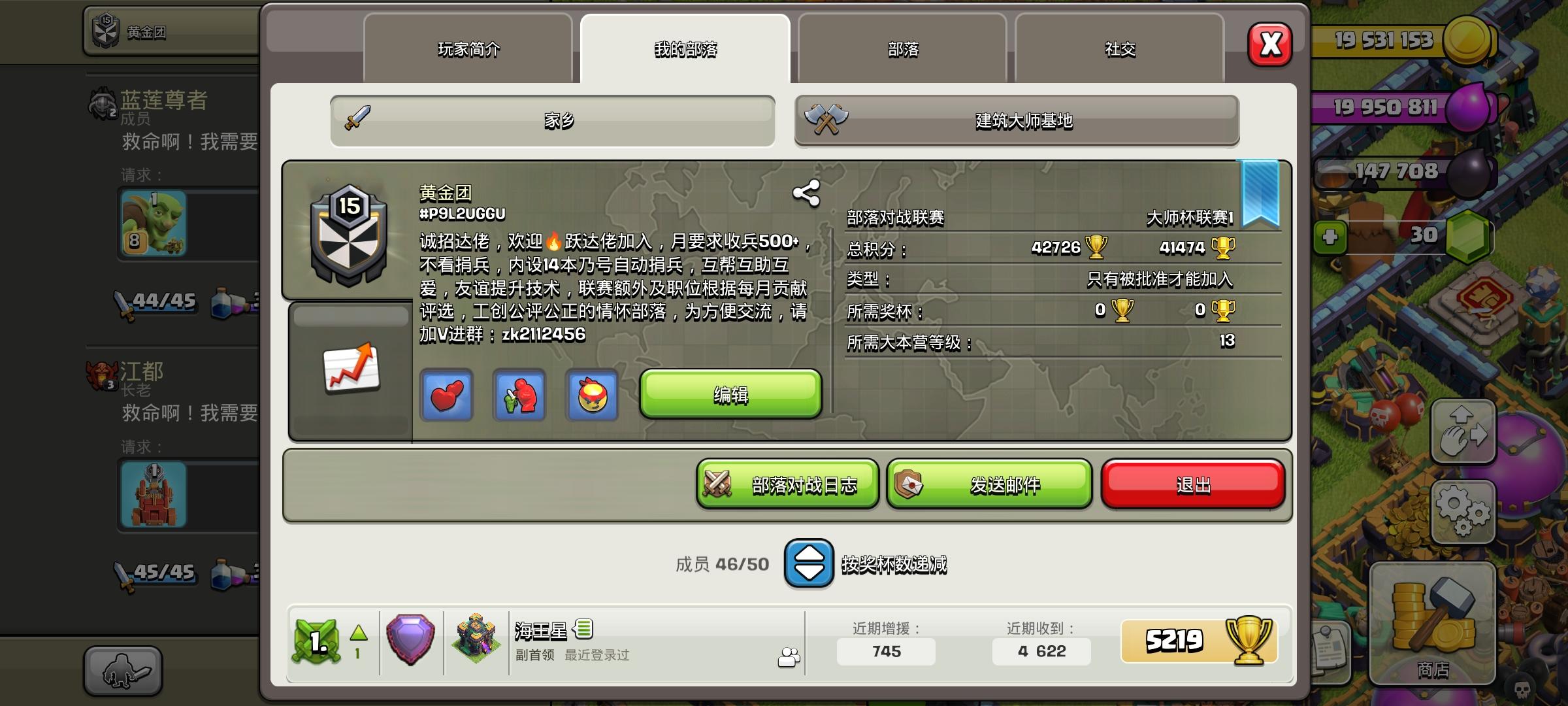 联赛后日常招人部落名:黄金团部落标签:#8P22G8LGG联赛等级:大师一竞赛等级:12万分左右部落内置三奶24小时捐兵,14本居多,部落战连开。联赛额外奖励公平公正公开,部落有自己的微信群,各成员日常活跃,气氛很好。如今部落冲突辉煌不再,剩下依然坚守的玩家可以过来一起抱团取暖。