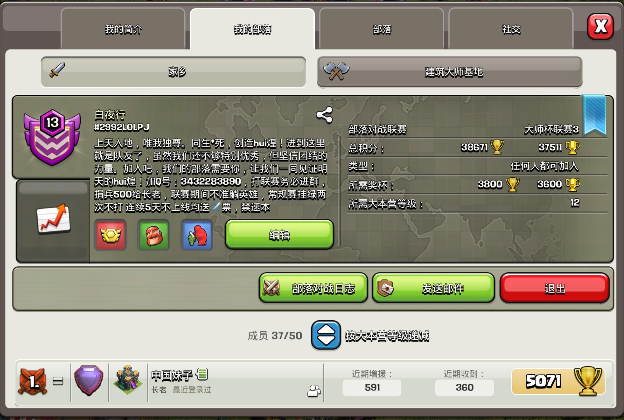 招募10本以上活跃玩家1.满竞赛,满联赛,手动奶加互捐2.双部落,一个连开部落战,一个发育打部落战全凭自愿,挂红绿牌3.捐兵前二/稳本升本/联赛前几名获得额外币只招募活跃玩家,摆烂,摸鱼给[:01d]4.进群才能进部落,不然不放Q群:473405489