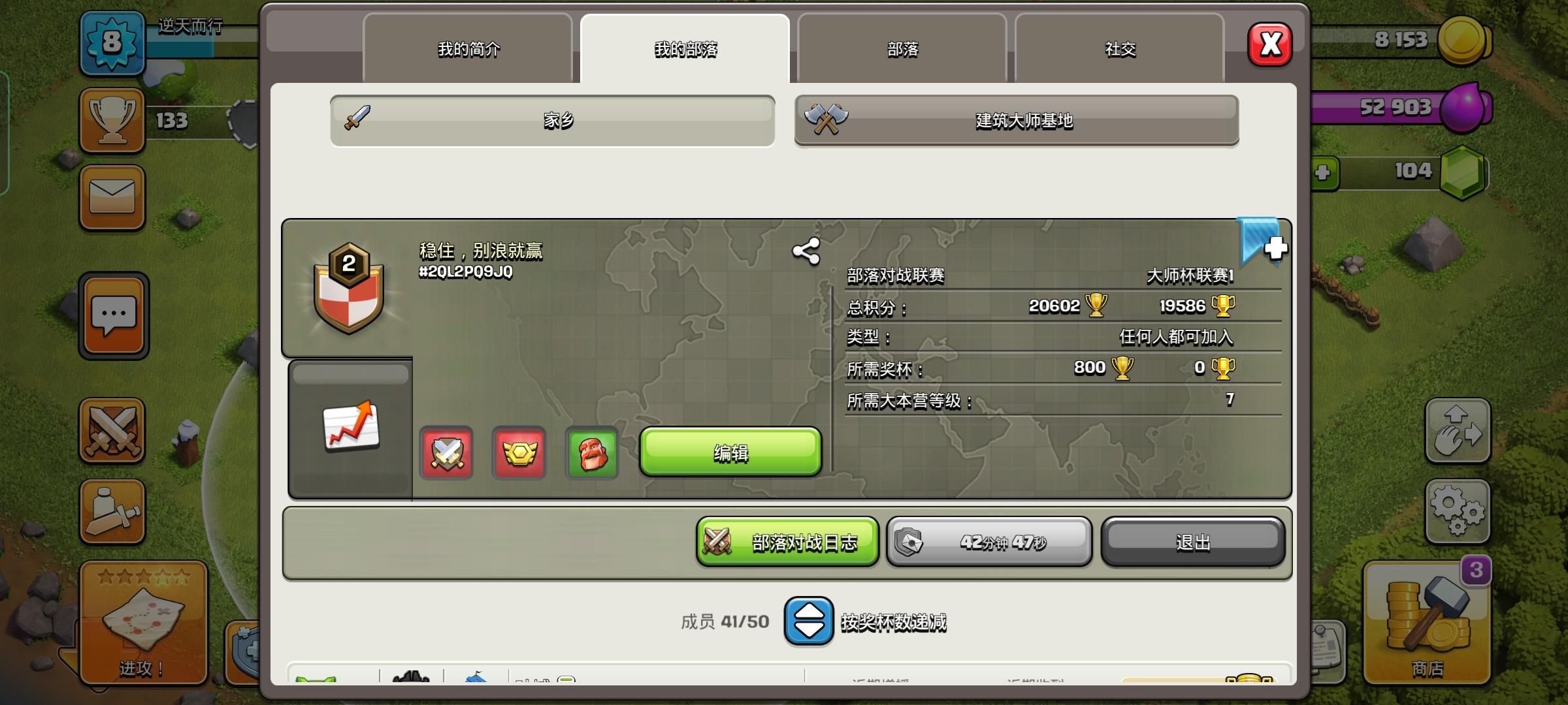 马上8级部落,招人! 部落战连开,41胜,1平,6负,平均摧毁率95以上。