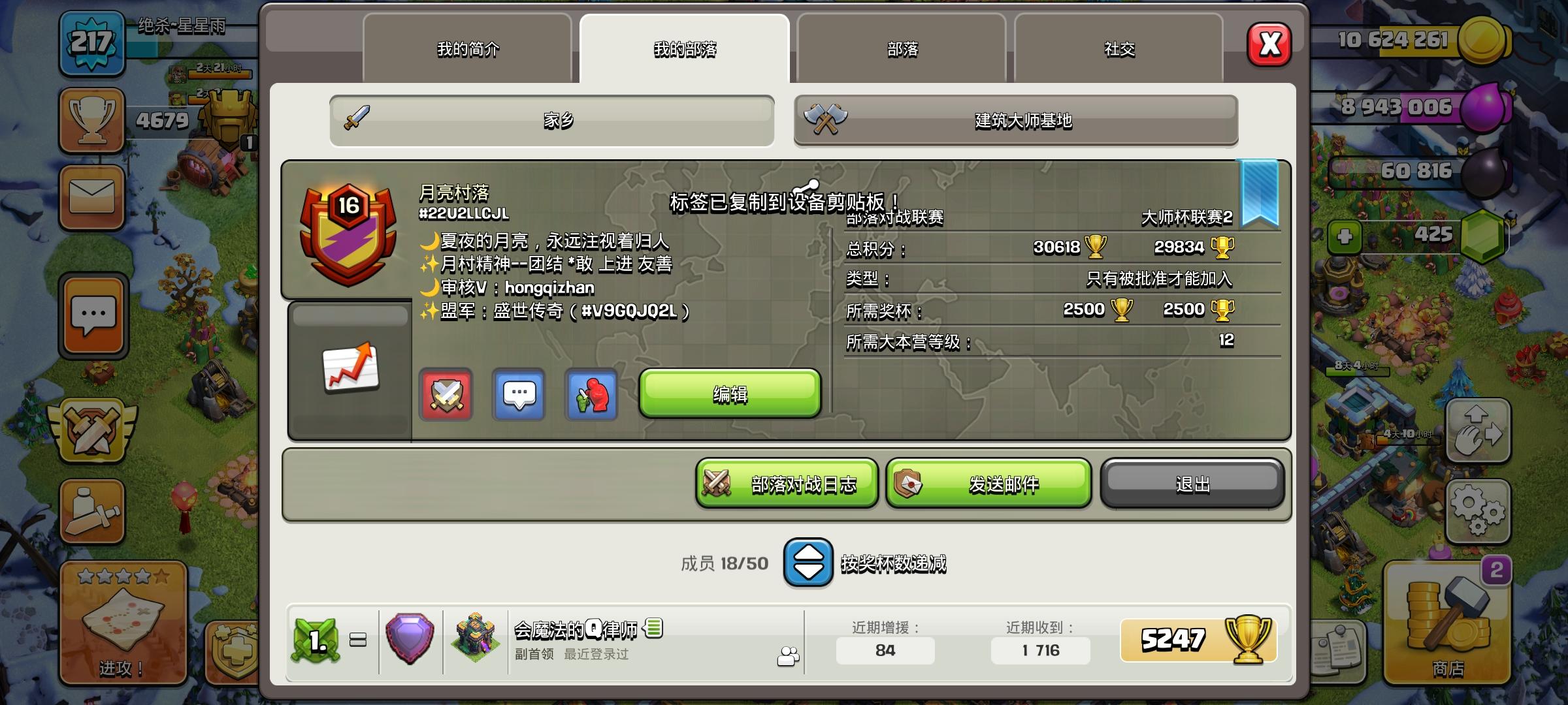 16级部落月亮村落🌙,标签🏷️#22U2LLCJL。部落战连开,活跃度保证。内置双奶。联赛大师二,有大师一壳子,双管理分配人数,按排名前八分发额外奖励,管理无联赛额外奖励特权,额外全看实力✊🏻主招12本及以上稳本玩家,12本以下但极其活跃玩家给予特殊考虑🌹有意者加我微信,然后我拉你进部落微信群。二维码如下~&&&备注:本人是副手,首领是萌妹纸🌝🌝。大本等级较低,在壳子与本人主管联赛~欢迎有意玩家加入我们!❤️