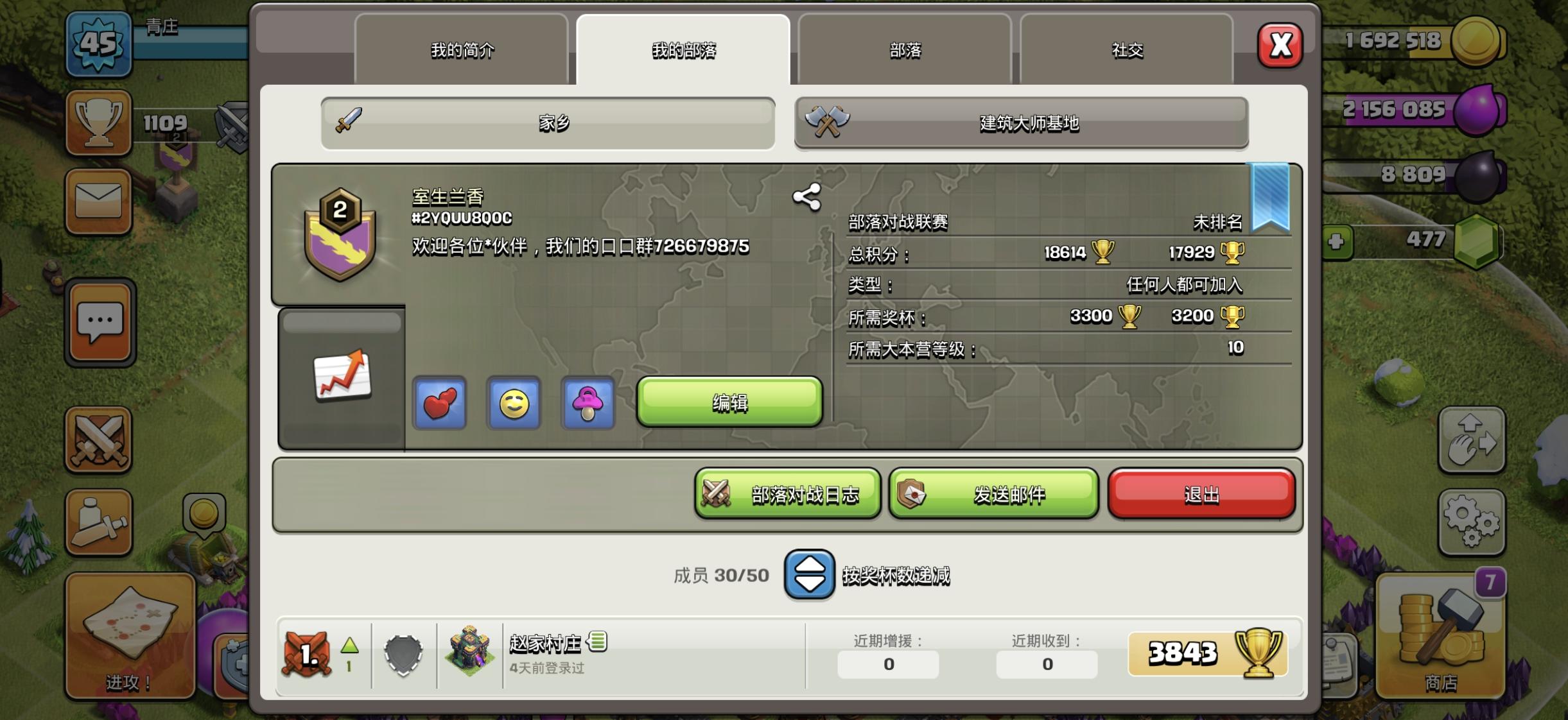 部落标签: #2Q20ULUY0 (国际服)部落联赛: 金杯3部落都城:5级部落概述:休闲部落,竞赛能满,部落战连开,联赛报名参加加入要求:只要每周打部落都城即可,要打联赛的尽量加一下群,部落QQ群:650718550