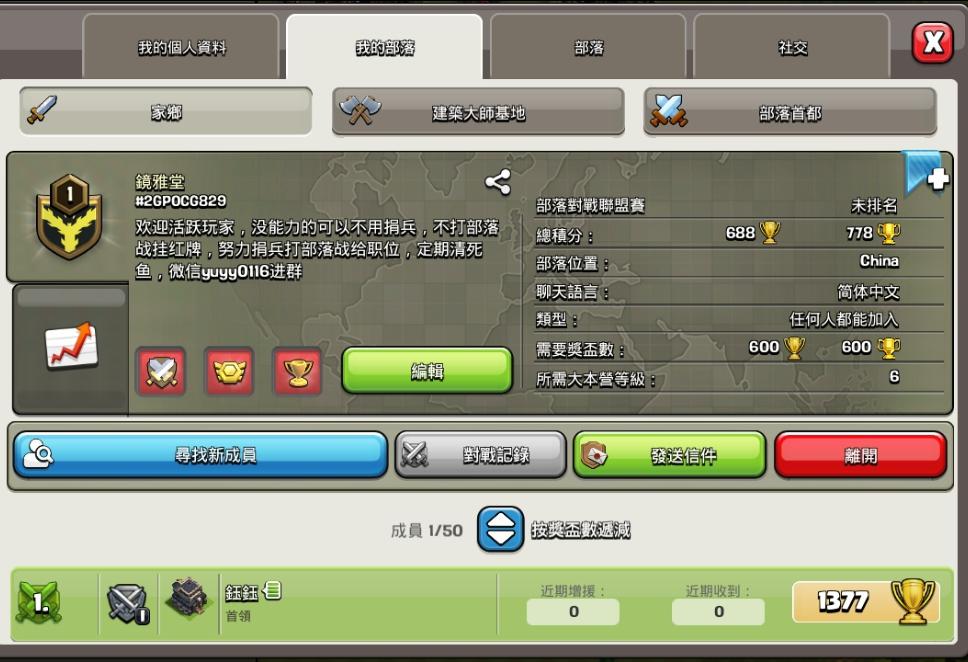 国际服新部落招人名称:鏡雅堂(繁体字)#2GPOCGB29欢迎活跃玩家,没能力的可以不捐兵,记得打部落战,不打挂红牌,暂时收速本玩家微信群:yuyy0116