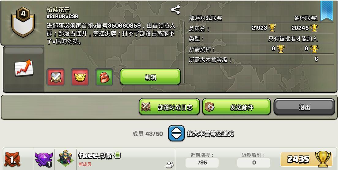 部落标签: #2Q20ULUY0 (国际服)部落联赛: 金杯3部落都城:5级部落概述:休闲部落,竞赛能满,部落战连开,联赛报名参加加入要求:只要每周打部落都城即可,要打联赛的尽量加一下群,部落QQ群:650718550