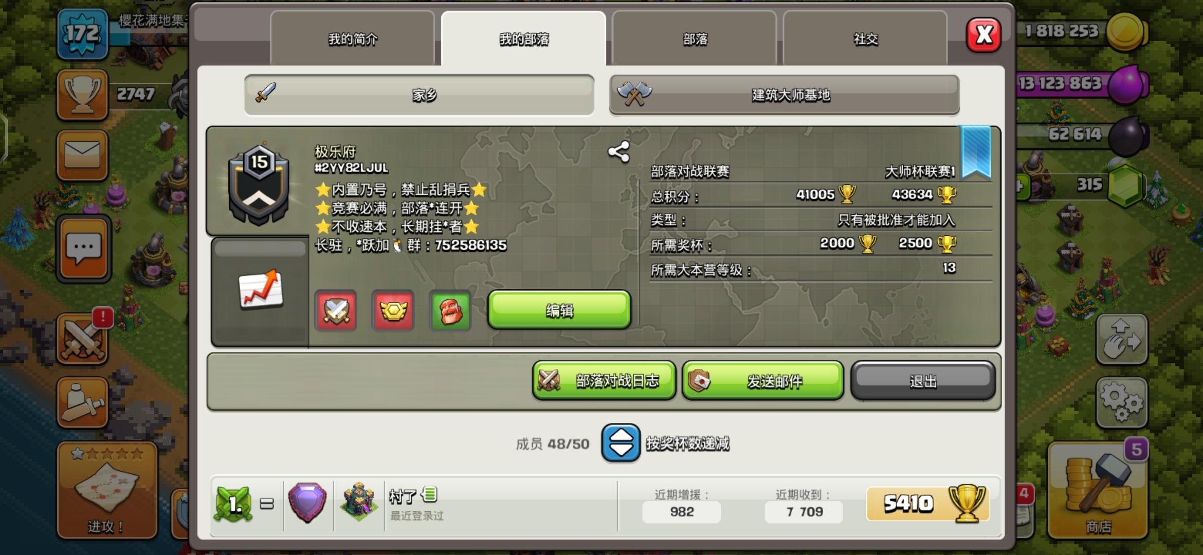 部落名称:极乐府部落标签:#2YY82LJUL部落等级:15部落联赛:大师一部落交流🐧群:752586135部落特点:内置双奶、部落战连开、竞赛必满、聊天活跃,日常99➕!收人条件:十二本以上非速本活跃玩家,禁止长期挂红,联赛和竞赛必须参加!