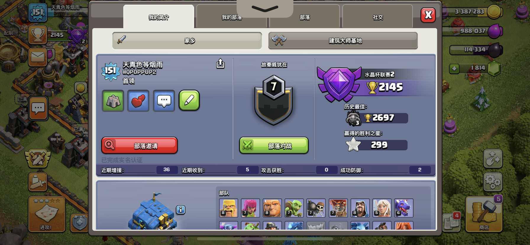五级部落 万家灯火 #2YQ8LJGCU欢迎各位活跃萌新和大佬进来切磋,打部落战,互相捐兵提升拆家技术
