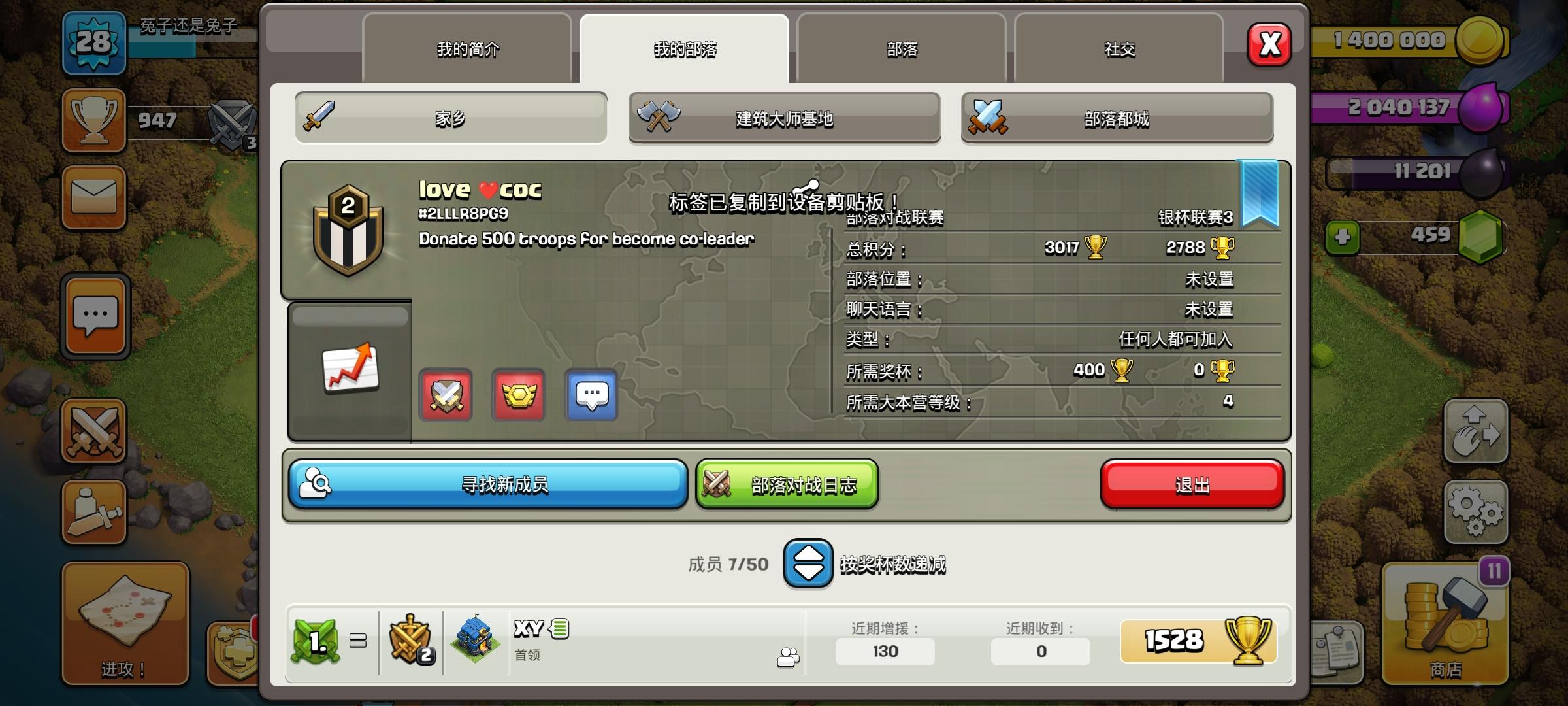 部落#2Q89LJ9VR,低本来,捐兵及不及时不知道,但等级一定嘎嘎高(相对低本来说)。来吧来吧,这个部落就俩人太凄凉了,部落赛都打不了,想升级都没机会😭