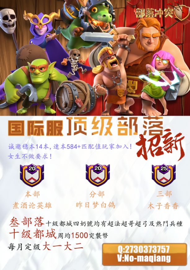 (国际服)(国际服)昨日梦白鸽部落收人,气氛活跃 三部落六奶十都,三部落均有超法超哥超弓及热门兵种,安排大一定级及大师混营,稳14起收,女生无要求,打部落战,群聊活跃速13可收