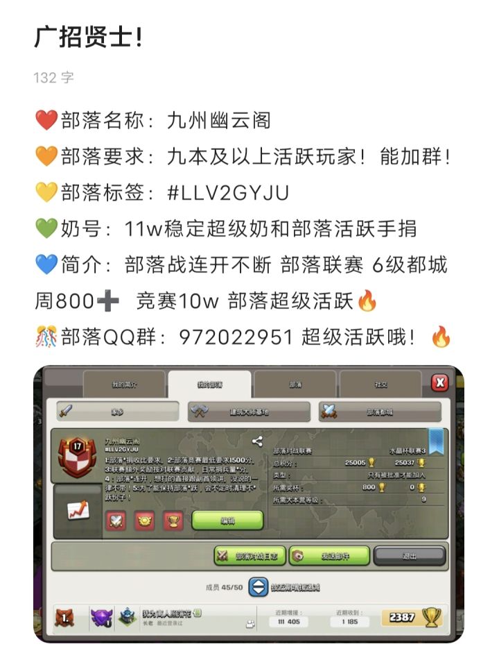 ❤️部落名称:九州幽云阁🧡部落要求:九本及以上活跃玩家!能加群!💛部落标签:#LLV2GYJU💚奶号:11w稳定超级奶和部落活跃手捐💙简介:部落战连开不断 部落联赛 6级都城周800➕ 竞赛10w 部落超级活跃🔥🎊部落QQ群:972022951 超级活跃哦!🔥
