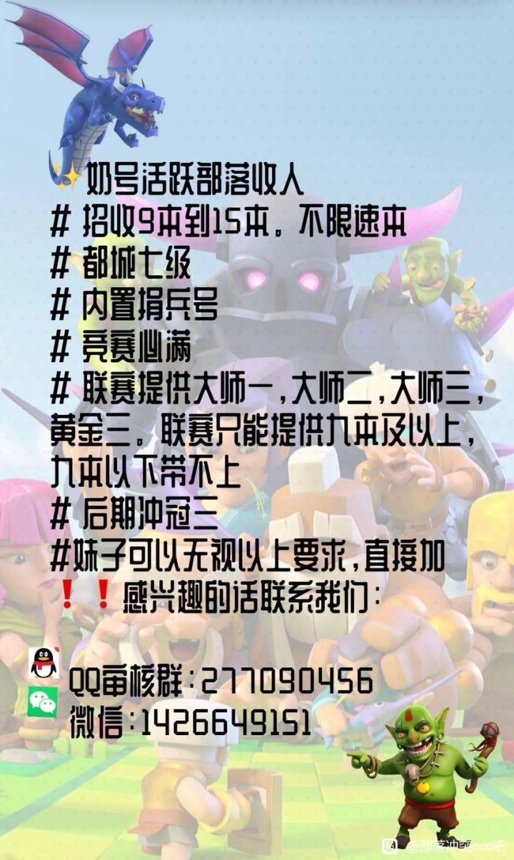 ⚠️国际服⚠️部落招人部落名:向日葵幼稚园-中班(#2QJRPP9VV)8级 黄金3 都城7级部落分部,招募新玩家。招募9本及以上常驻玩家(速本也欢迎)并且常驻 常玩的。有意加群聊如果你希望找一个活跃部落 那么加入我们就对了。平时都是互相手动秒捐。竞赛分数都很高,联赛轮流上场打满8星。⚠️ 有意者请先加群了解规则 直接申请部落的 都会拒绝!qq群:582137420微信:wkw0