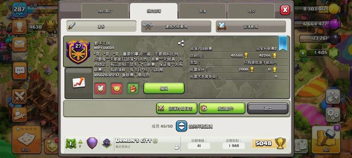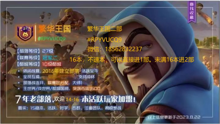 30级部落,成立7年。招活跃人员。16本人员(非速本)可直接进入主部落。联赛冠军三,都城10级,每周1500都城币。联赛分5个部落打。1部和2部均有24小时奶。部落战天天打。欢迎高手加入。招收15-16本人员。有部落群,可加微信18562832237. 部落标签 #RPYVUCQ9。15本以下人员可以去2部。微信里话痨较多,部落男女均有,不定时撩骚,喜欢的加微信,拉你进群