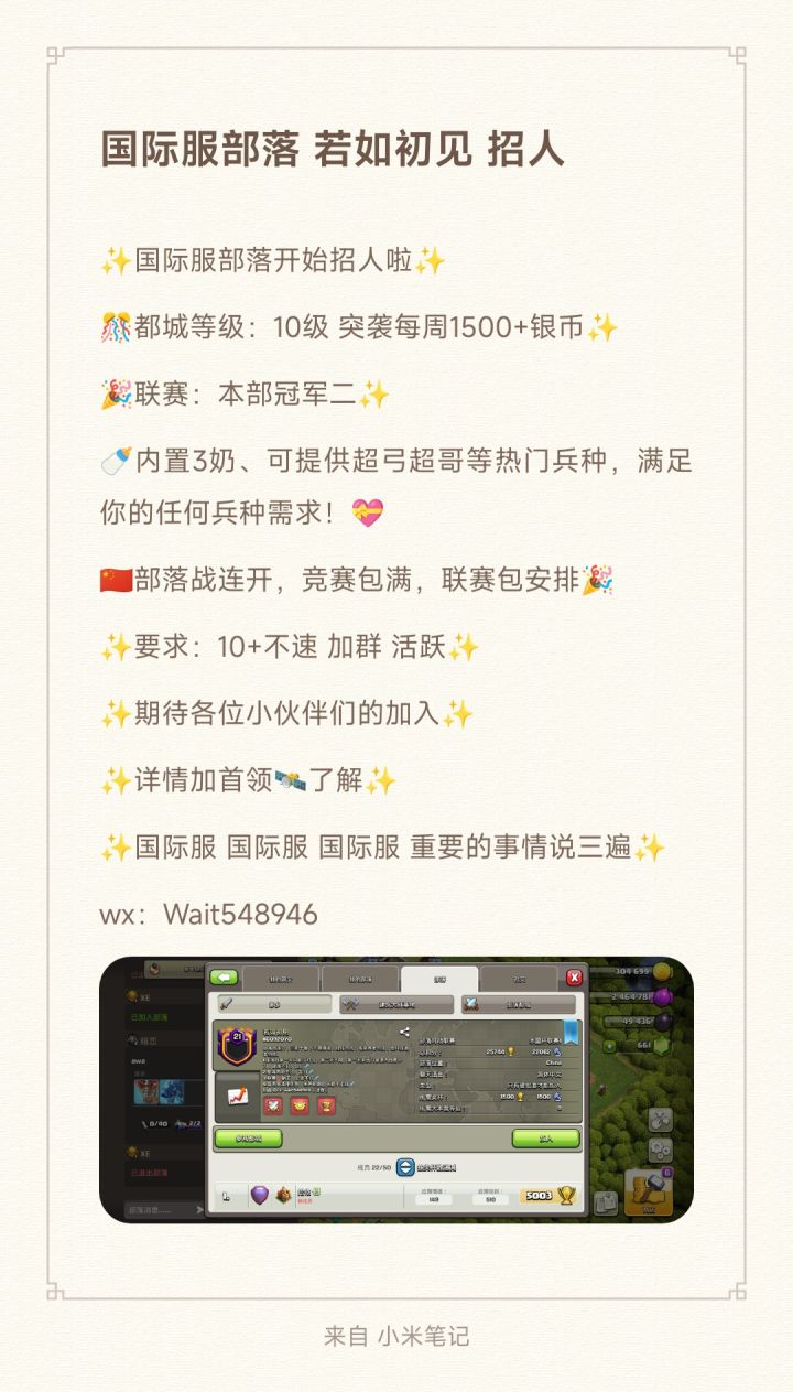 ✨国际服部落开始招人啦✨🎊都城等级:10级 突袭每周1500+银币✨🎉联赛:本部冠军二✨🍼内置3奶、可提供超弓超哥等热门兵种,满足你的任何兵种需求!💝🇨🇳部落战连开,竞赛包满,联赛包安排🎉✨要求:10+不速 加群 活跃✨ ✨期待各位小伙伴们的加入✨✨详情加首领🛰️了解✨✨国际服 国际服 国际服 重要的事情说三遍✨wx:Wait548946#招人#部落冲突