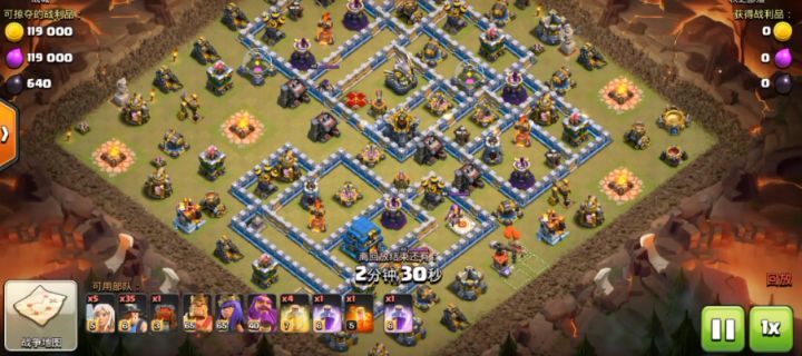 矿工流派可以说是一个特别好用的陆军流派,在十本和十一本的矿工流更是具有统治级的表现。但很多首领发现矿工流在针对防御血量特别高的十二本后期的时候进攻效果往往不尽人意,很多首领会选择用混合流派甚至放弃矿工流,那么今天这场冠军联赛的矿工流会有着怎样的表现呢?让我们一起来看看这把矿工流是如何征服冠军联赛杯满防御十二本的吧!首先我们来分析一下敌方的阵型,对方是一个近乎满防的十二本,离十二本满防只差少许墙,