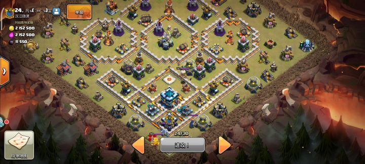 先说一下,这次挑战发不了视频1 我实时打,我会乱屏幕行观察及双线操作。2 对部落系统给的兵栏实在不适应,易下错兵。我最高记录二星95%,那我作图分享思路。前戏1 飞艇超亡这一块,画X的是我打的一些防御,到多头旁的吹风机是落点,如果这发挥好,可以再打一个单多/或多头。手动下落→法术顺序:隐身→狂暴→镜像→隐身→隐身前戏2 四王前戏(咏王地面)3点,雪怪加法师打改装加农炮(断边),兵营处