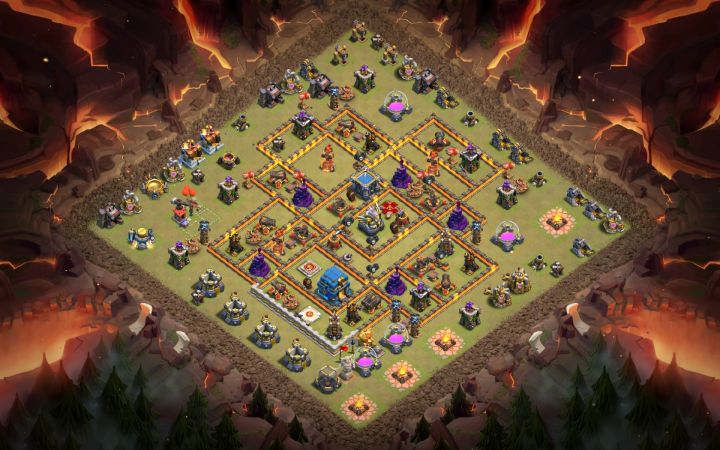 在11本部落战中,回字阵型已经流行很久了,基本会打的首领可以随便推平,而不会打的只能勉强拿个1星了,这是为什么呢?主要因为回字阵型属于引导性质阵型,一旦部队从外围进到内圈,部队将变得不可控起来。也就是说你不知道你的部队会往哪个方向走,所以回字阵型以前的打法基本都采用狗球流或者天女狗球流,但之前的更新中有了蝙蝠法术,这就让回字阵型有了更简单的打法,今天就为各位首领具体解析一下!阵型分析从上面的阵