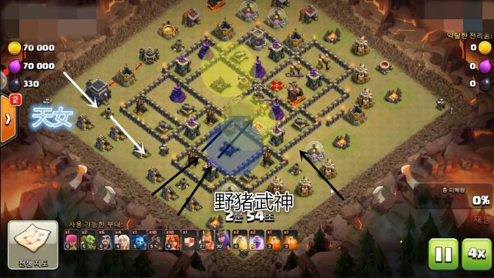 在部落冲突的九本部落战中,天女武神野猪流虽然是一个不常见的流派,但是用过的首领都说好,比皮卡还要暴力。武神流的优势有很多,比如抗伤害,攻击力也高,并且有了狂暴法术加成后就更加暴力了。不过缺点就是“智商低”,得首领们铺好路才能进到想进的地方,打该打的建筑。阵型分析我们可以看到整体阵型是比较密集的,这就给武神创造了比较好的机会。武神可以选择从7点进攻,天女从9点,为什么天女从9点进攻呢,因为9点这