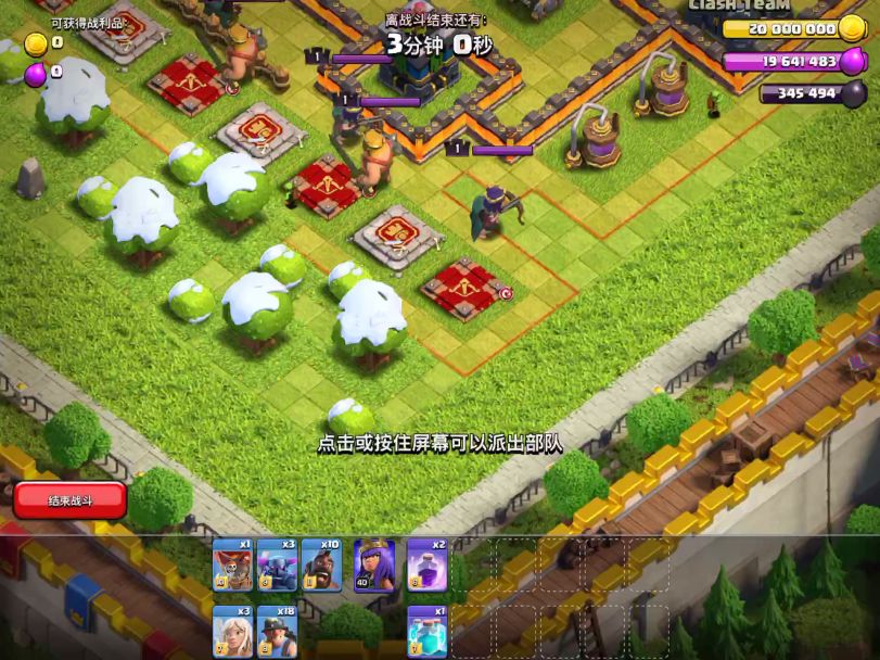 本视频只做给有需要的人,不需要的划走就是了,不必比较剩余时间兵力什么的,能过的都是好打法。野猪引援,然后立即在角落下天女,天女杀完1女王1男王后,哥布林到了,正好打哥布林,注意此时不要引到女王。待天女开始打冰人后,下个皮卡帮打,要不冰人减速要打很久。打掉冰人后,在另一个角落下剩余2皮卡,清双边。中间矿猪平铺,镜像复制矿猪,狂暴推进。有时候天使会进去奶矿猪,那就能很轻松推完,如果天使没转奶