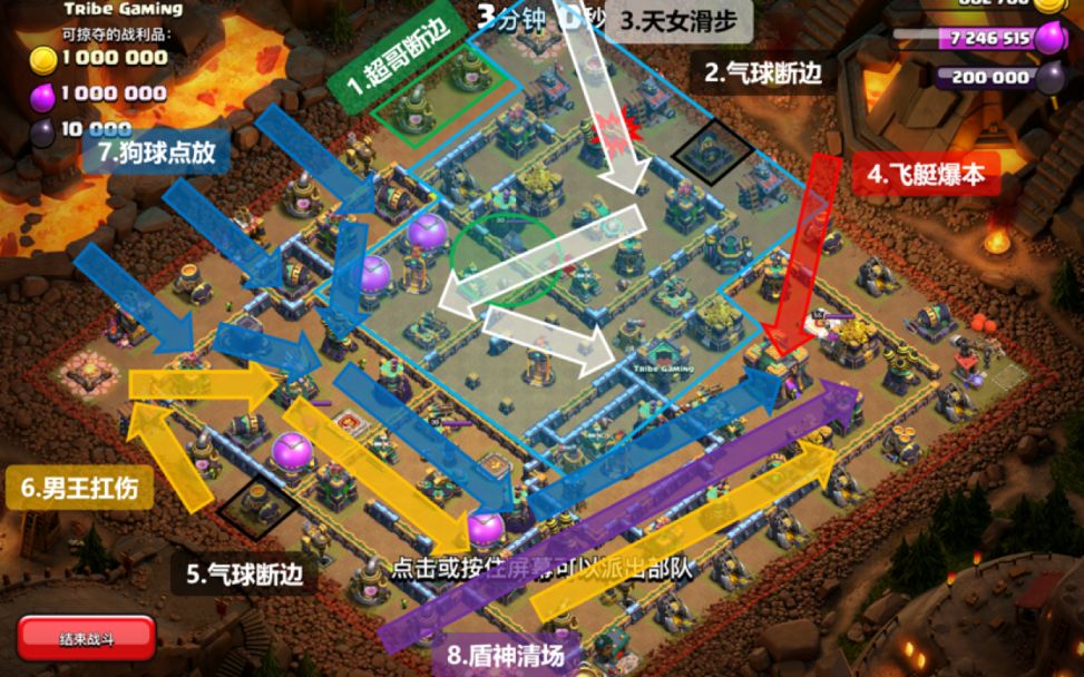 网上应该已经有视频了,是不是跟我的一样不知道,也不在意,反正我是自己琢磨过的,只想着发出来帮助更多人,犯不着大费周章去抄袭,所以杠精请自觉退出去吧,看见就烦!言归正传,我估计很多人看了视频还是过不了,我猜是关键细节没处理好,下面一个一个说。天女12点方向下,超哥把11点的2个采集器断了,超炸在图中位置开墙,天女自然会滑步进去,等防空打掉后,放2气球打掉加农炮断边,投石炮那放个狂暴,一定要留女王