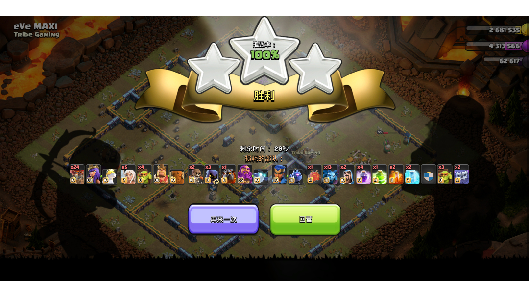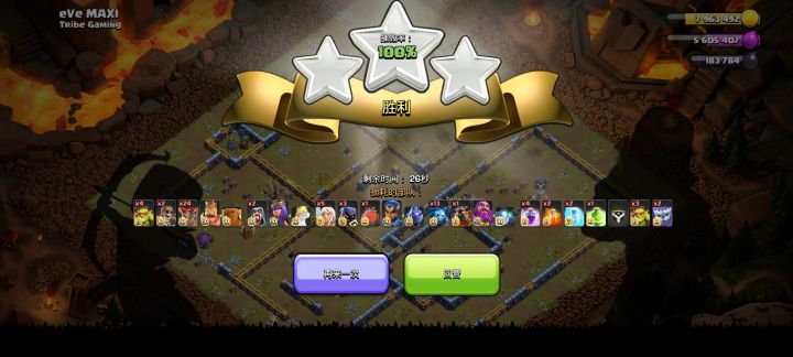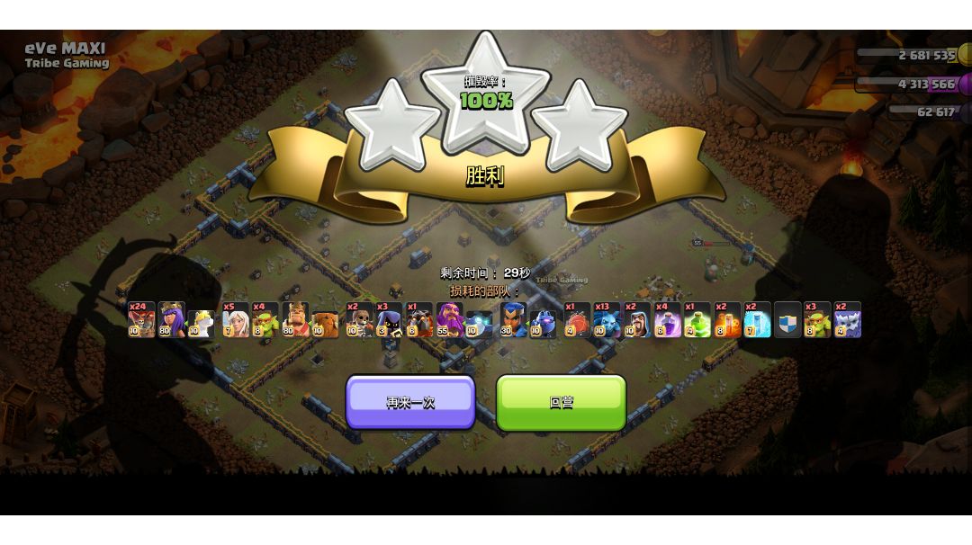 女王蛮王两边包抄,女王任务端掉大本,蛮王砍天鹰,狗球永王12点到9点一字划全下,飞艇干掉投石机,小王躲在飞艇后面搞偷袭,能不能过关还需要附加一些些运气….😅