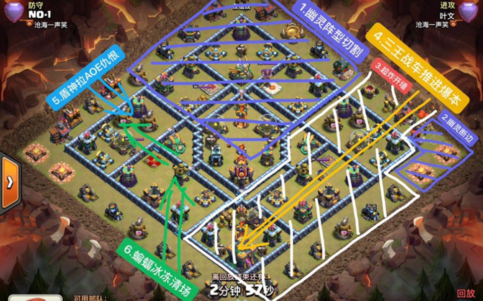 这次活动并不算太难,主要是误导性很强。我的打法是分三个方向进攻,9点钟方向下三王和大部队,2点方向一个武神,6点战神和一个武神打,记得先放几个小兵吃陷阱。9点开墙后双王开大就完事,隐身保女王单吃大本,最后战神开大和一个武神收尾,简简单单。