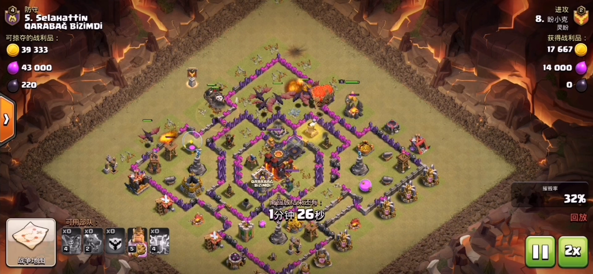 这次对阵的依然是速本的 一个速本十和一个速本九 这次的视频算是给待在七本一段时间的萌新老手们的攻略吧😁 十本没有地狱塔那么像视频上的情况,七本的可以思索了后,就去打一下 而对于九本,如视频上的,炸弹塔那个位置,如此密集的建筑那样就要发挥闪电范围伤害的优势,去封路让主力的龙群不飞偏,而对于空气炮,就集中气球去炸掉,万不得已的话,通常都禁忌正对空气炮 (前提必须下龙和劈雷很熟练了) 希望看了此视频的七本老手们以后看见类似这种速本的就不要怕,只要熟练透了,胆子还大的就打上去 我就是在七本和八本各个阶段玩龙流打了四年了,所以基本没任何顾虑😁 用时间来,慢慢就成大佬了,如果终身玩部落那急不得