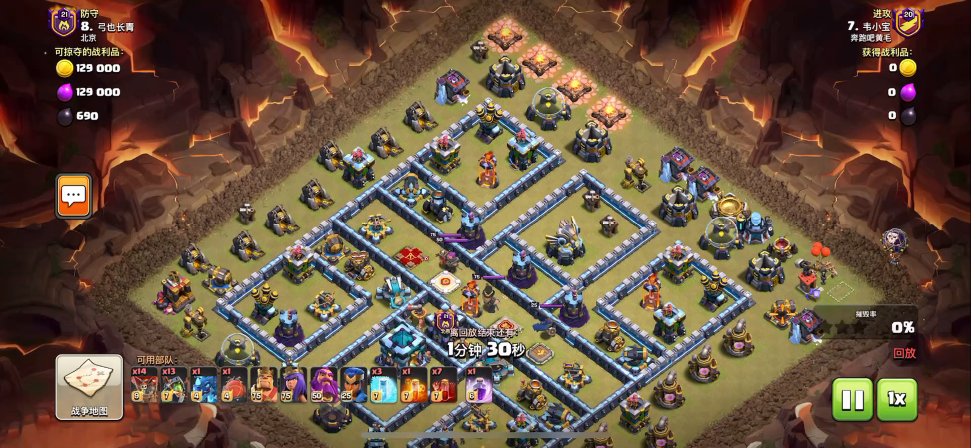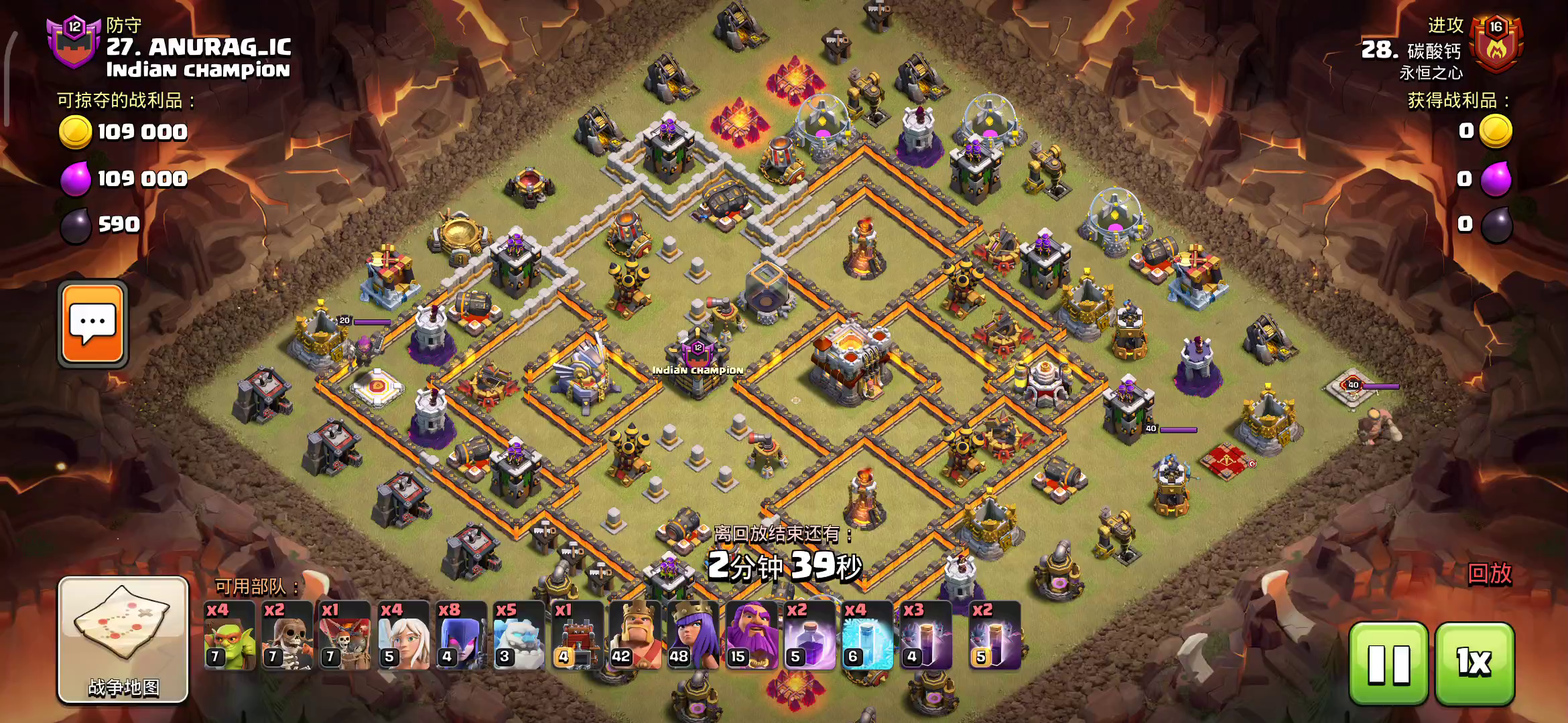 首先女王打掉鸟炮,注意清边配合,其次12点下滚木车,补上冰人,超级法师疯狂输出,后补上蝙蝠收尾。虽然最后一处法师塔失误,但仍旧三星。