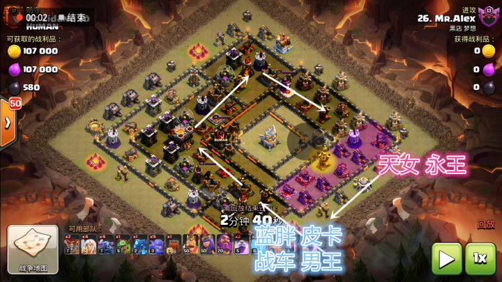 天皮蝙流派实际上是多种部队的组合,流派中包含皮卡、天使、蓝胖、女巫、冰人等等,这是一组比较强力的混合部队,多用于11-12本部落战。其打法思路就是选用天女先扫一下边,之后配合战车天皮等部队一同进攻,而法术方面配蝙蝠、冰冻和狂暴法术即可。该流派有着三星率极高和容错率极高的优点,下边就来看一下应该如何用好这一流派。进攻分析 图上已经标注的比较清楚了,这里就简单解释一下。天女和永王从3点往6点进攻,