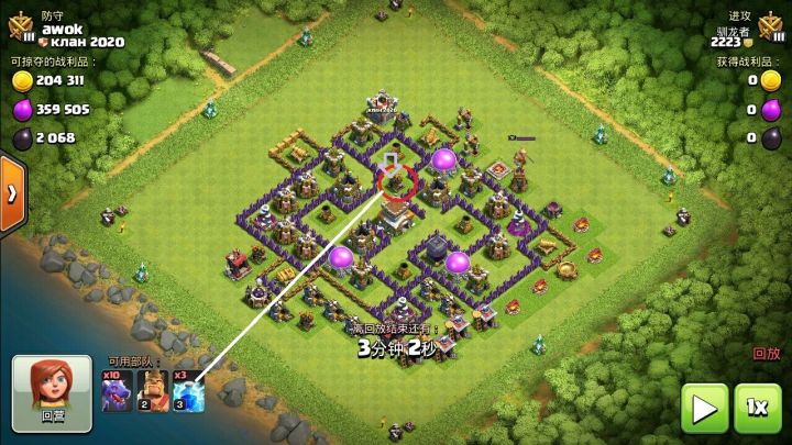 兵种:十条火龙法术:3瓶三级闪电 或 2瓶四级闪电和一瓶狂暴部落援兵:(黑)气球温馨提示:可以去练习模式中的“火从天降”里反复体验龙流的精髓。首先观察敌方阵营的防空火箭位置和空气“泡”朝向(空气“泡”对龙影响很大),尽量背对空气“泡”下龙,开战时,先用雷电法术打掉距离你要下部队最远的那个防空火箭或者是等级最高的防空火箭。玩龙流最重要的一点就是要会清边,就是让龙清掉敌方阵营的边边角角,防止