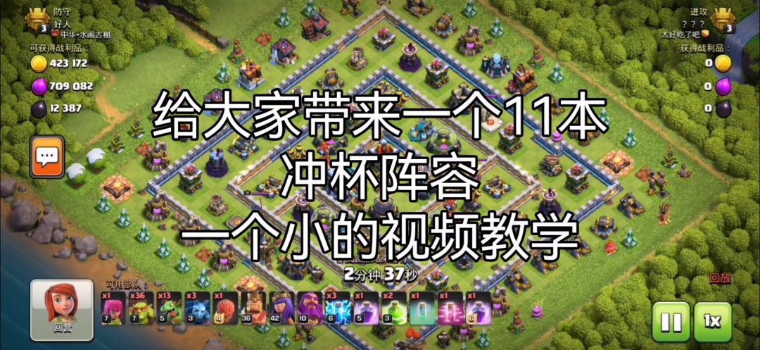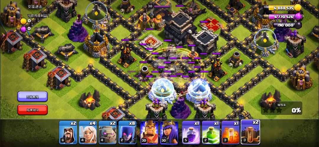 先用哥布林打掉大本营旁边的收集器 然后再下狂暴弹跳和极速隐身药水去解决掉大本营拿下一星 多余的哥布林用来清理防空火箭旁边的收集器 剩下就用龙宝和三王去补百分比 从而用这种方法去冲杯