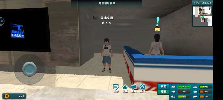 浅玩了半个小时,人物就一个男孩,然后就在超市里打工,人物钱给得太少,必须得看广告才能得多一点点,然后人物状态像流水一样,分分钟就没有状态,地图也小,没啥任务流程就是只能在超市,医院,或者帮路边摊看店