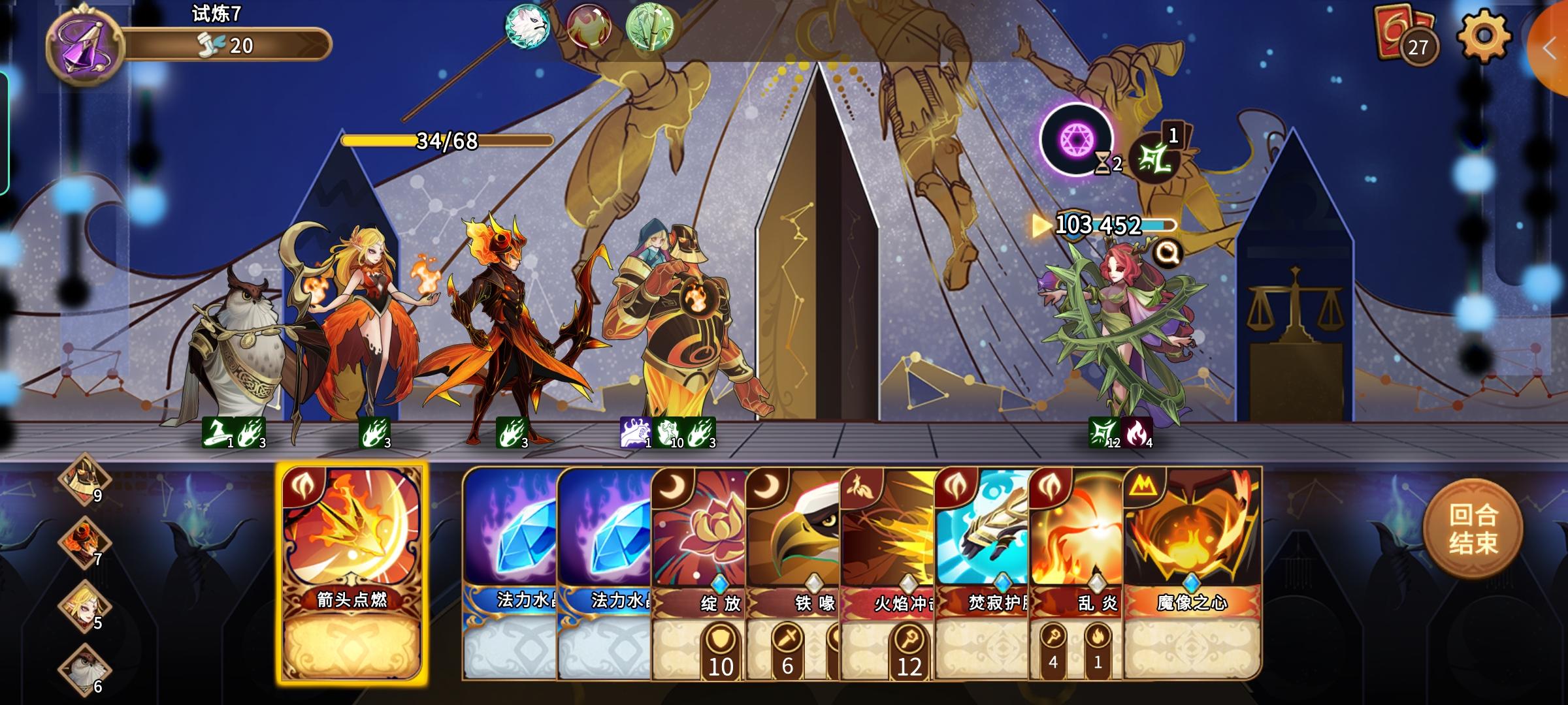 带了五个魔像之心,一打蔷薇时灵时不灵。攻击牌无法给有盾的蔷薇上火攻击牌计算次数有问题,疑似把火计算进去了(二张单攻,蔷薇反伤11层,结果我60火盾直接反没了…)玩了个蛋蛋